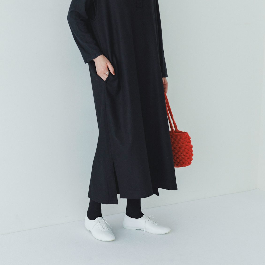 スリットのおかげで黒タイツやブーツを合わせても重たくなりすぎません。
