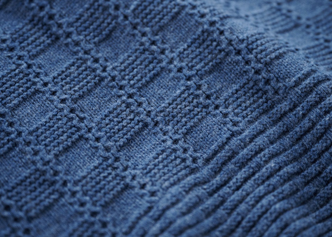 数ある模様編みのなかで目にとまったのは、インテリアに欠かせないカゴを彷彿とさせる「バスケット編み」という編み地。