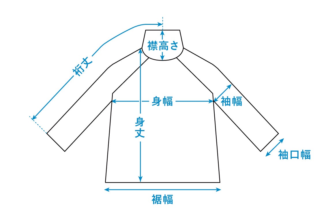 | 身 丈 | 前70cm、後ろ72.5cm | 前74cm、後ろ76.5cm | 前80cm、後ろ82.5cm |