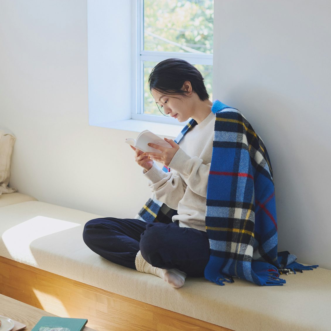 スウェット¥19,800/SLOANE(ザ ショップ スローン新静岡セノバ店)、バスクTシャツ¥20,900/ARMEN(ビューカリック&フロリック)、ブランケット¥9,790/TWEEDMILL(セムインターナショナル)