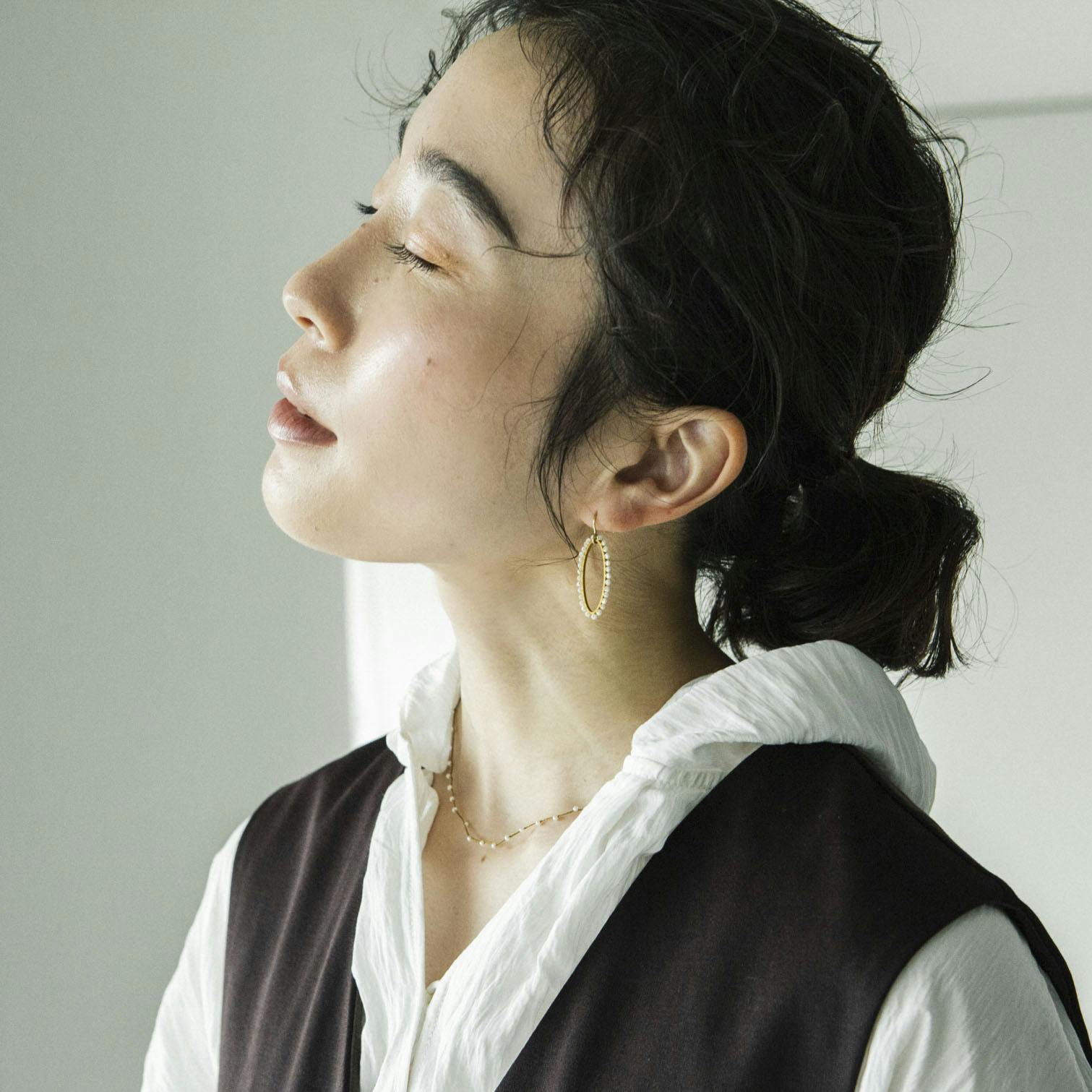 顔まわりでさりげなくきらめく耳飾りで、シンプルなコーディネートも程よく華やかな雰囲気に。