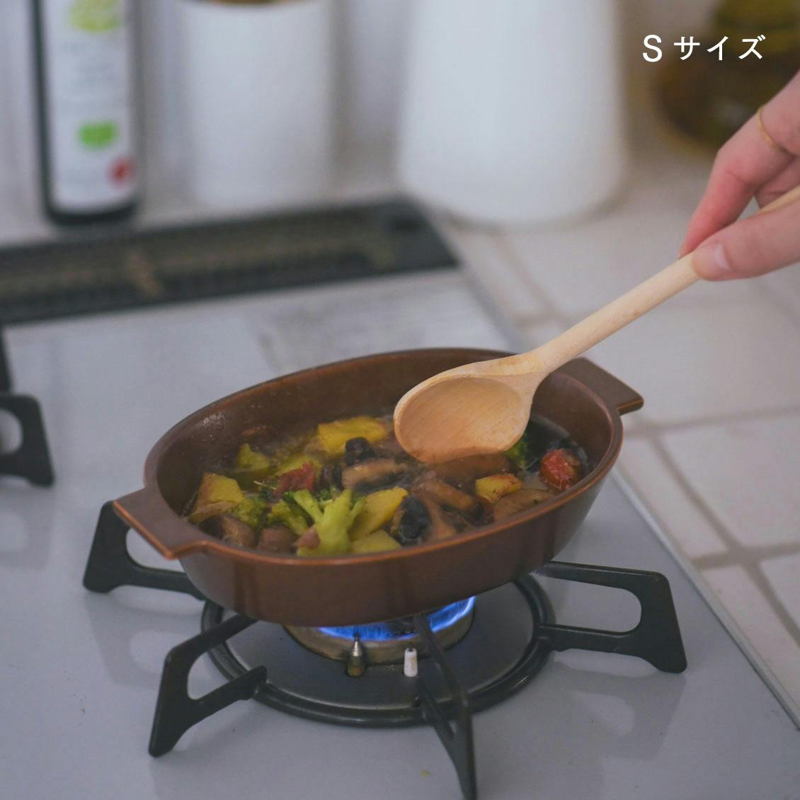 耐熱性の陶器でできているため、直火・オーブン・電子レンジでご使用いただけます。(※IH不可)