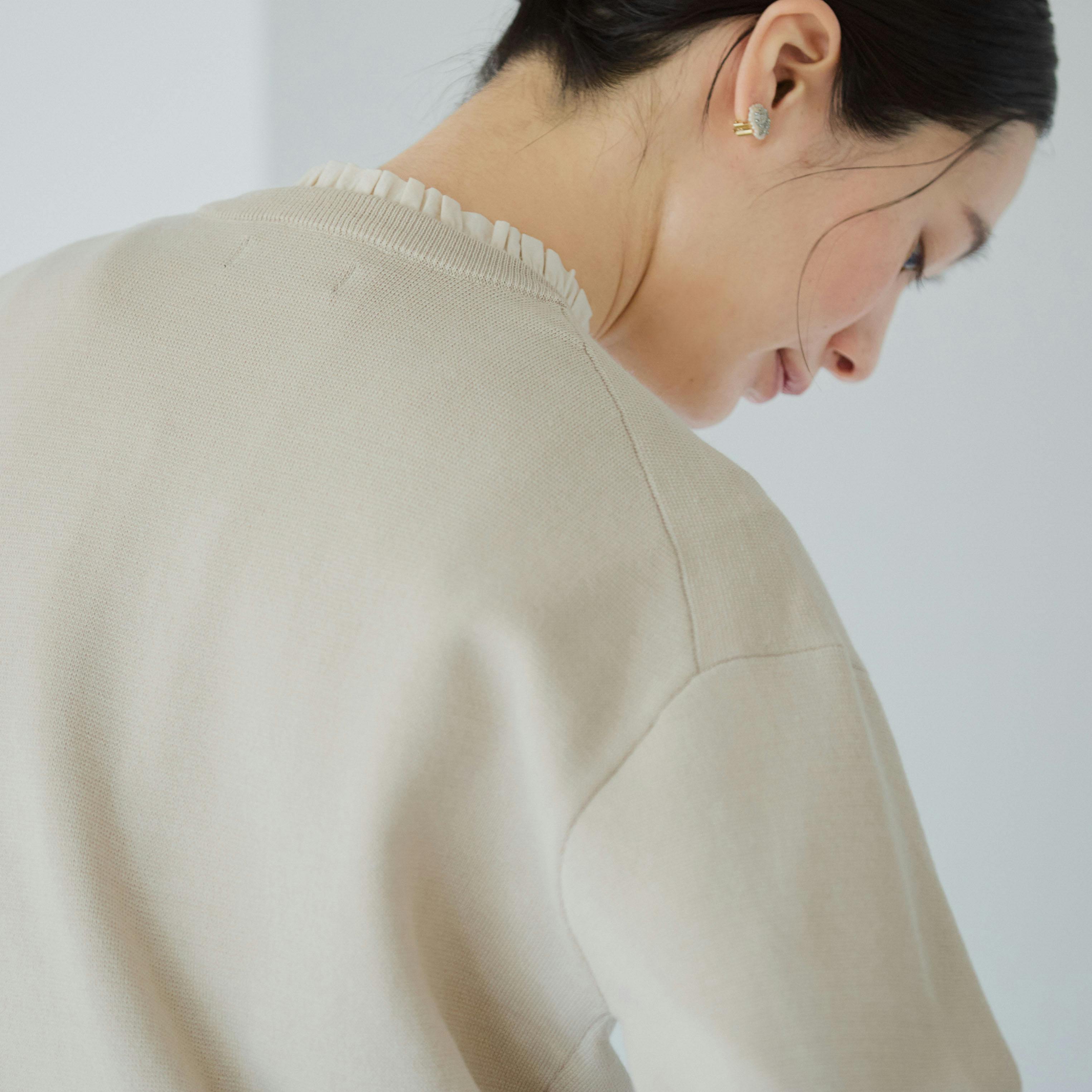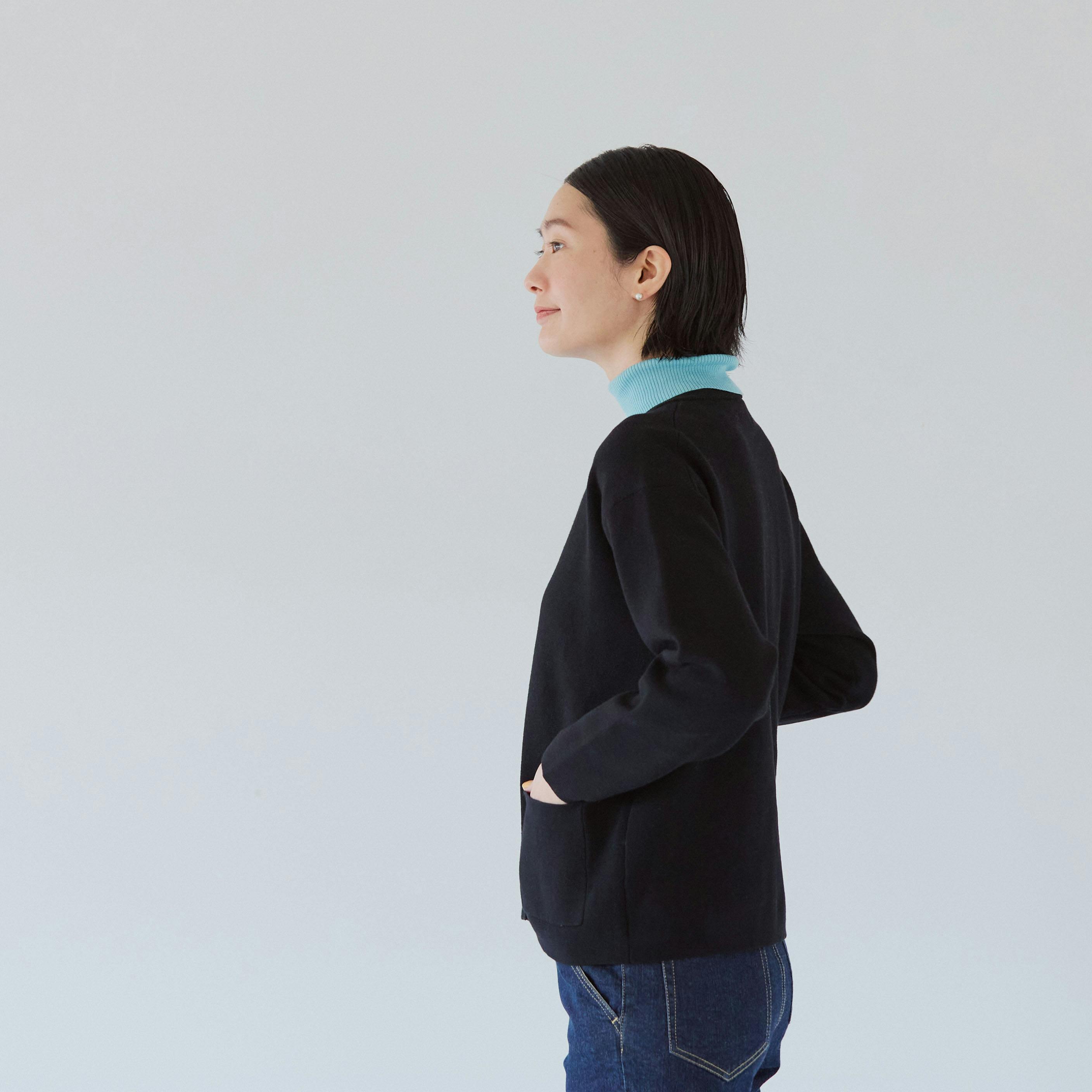 ややハリのある編み地は、下に着た洋服の形を拾いにくく、すっきりときれいなシルエットに。