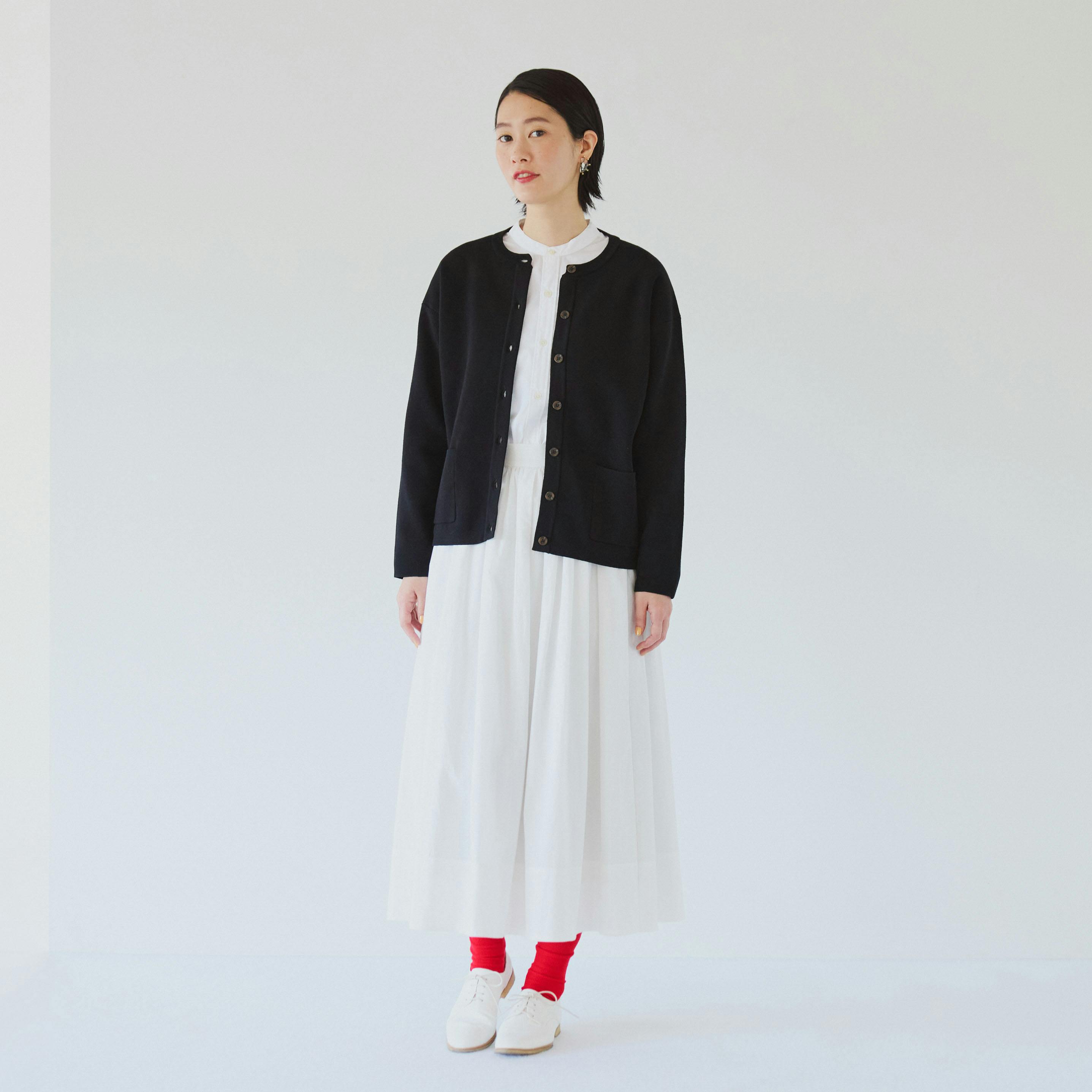 下に着るトップスとの組み合わせに迷わず済むように、カーディガンの襟の形は、広すぎない丸襟にしました。