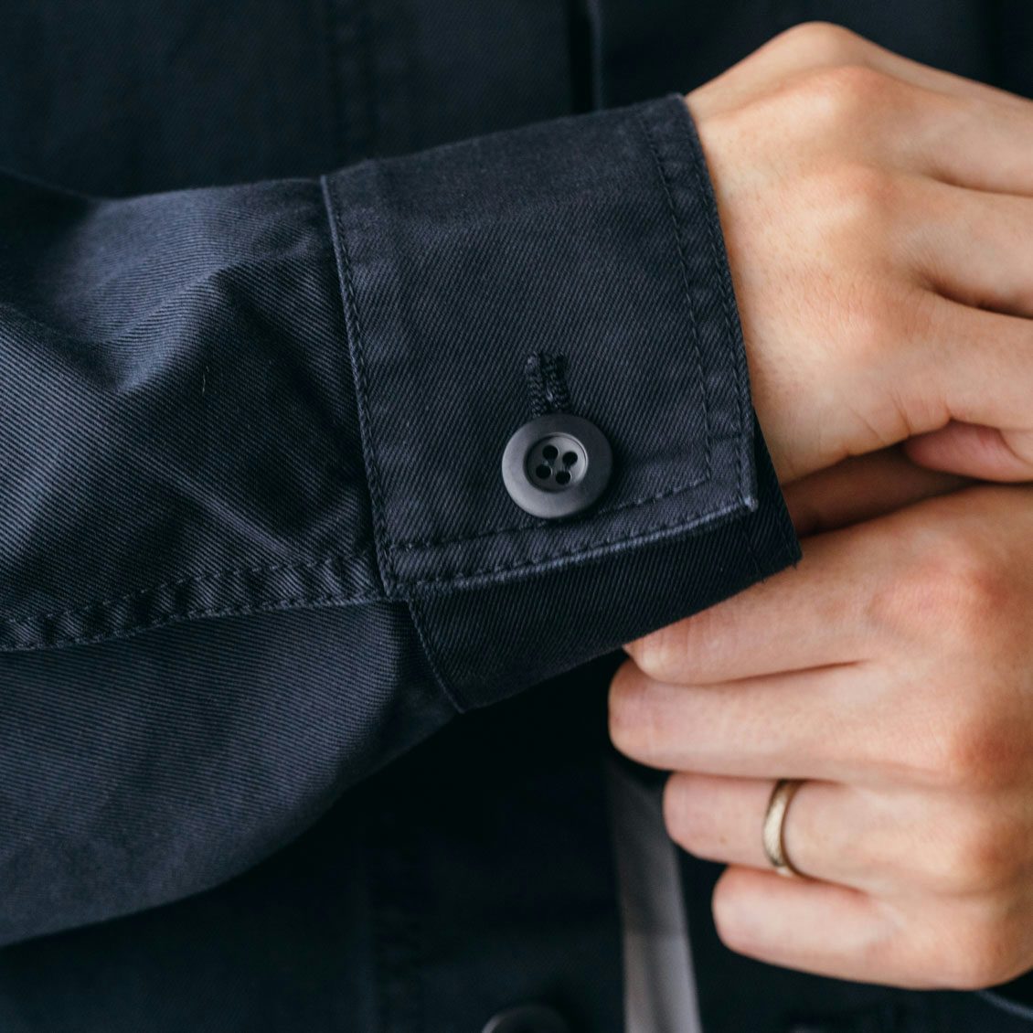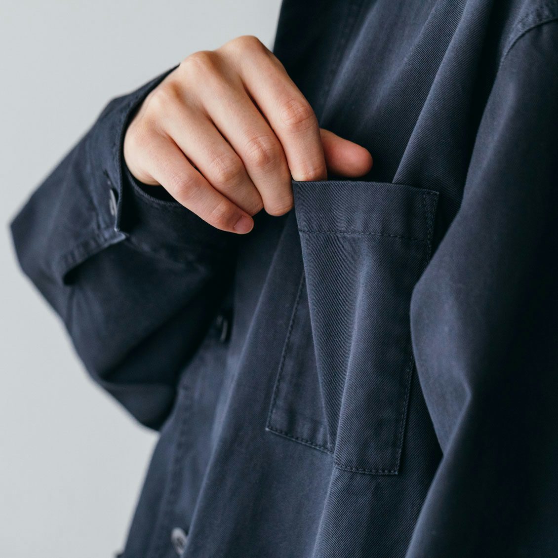 袖口と前身頃にはミリタリーボタンを、ポケットは上から貼り付けたようなパッチポケットに。