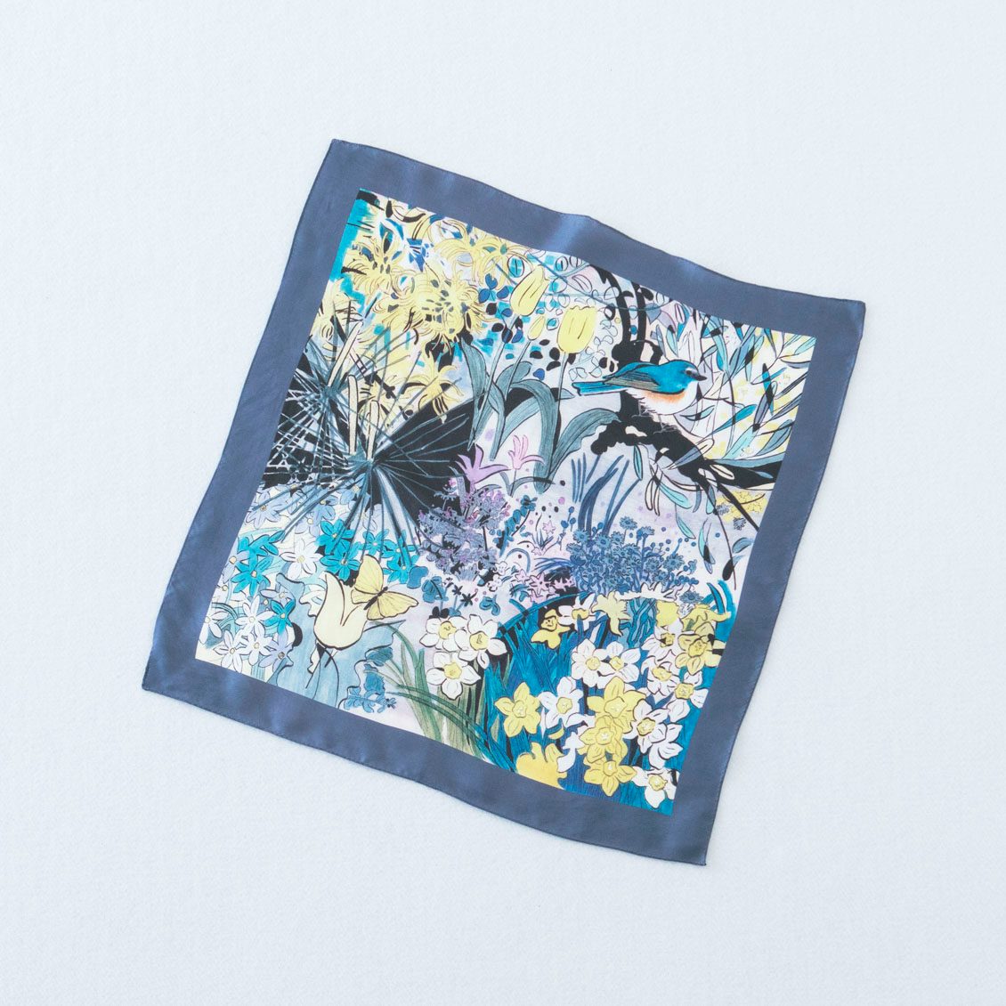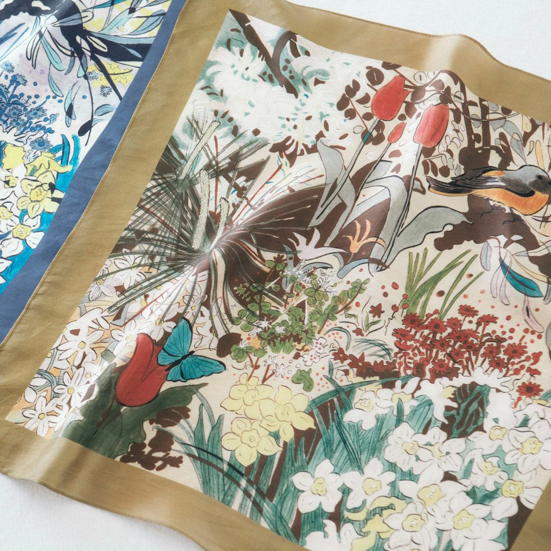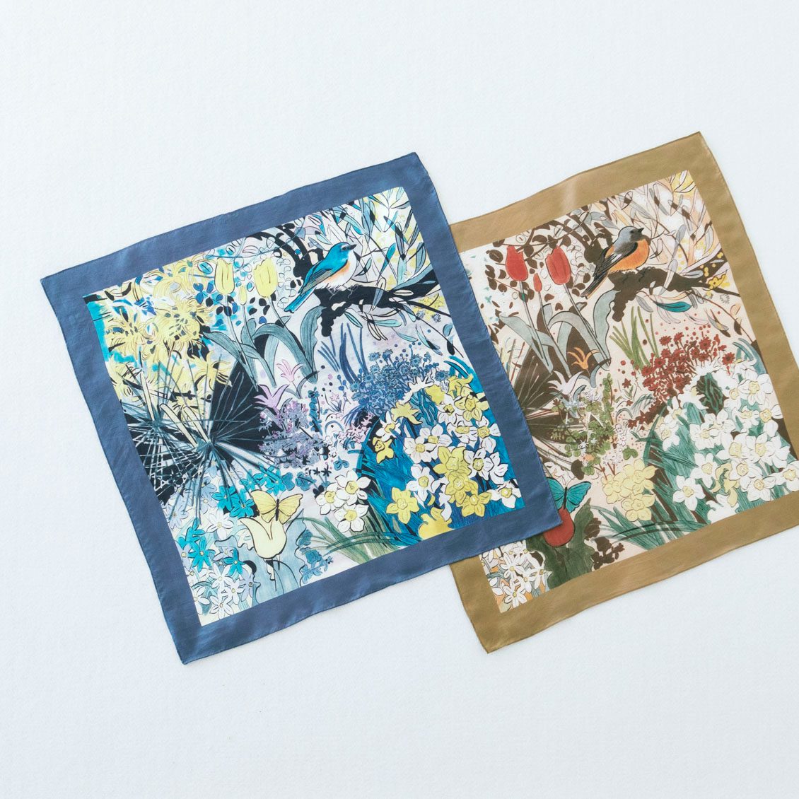 「日常に、ひとさじの憧れを」色づかいにこだわったシルクスカーフ / bird garden(ブルー、ベージュ)