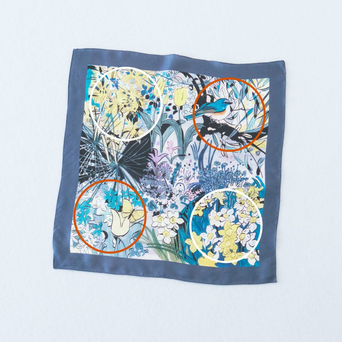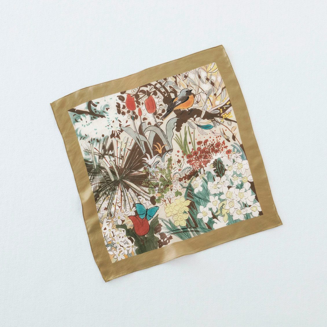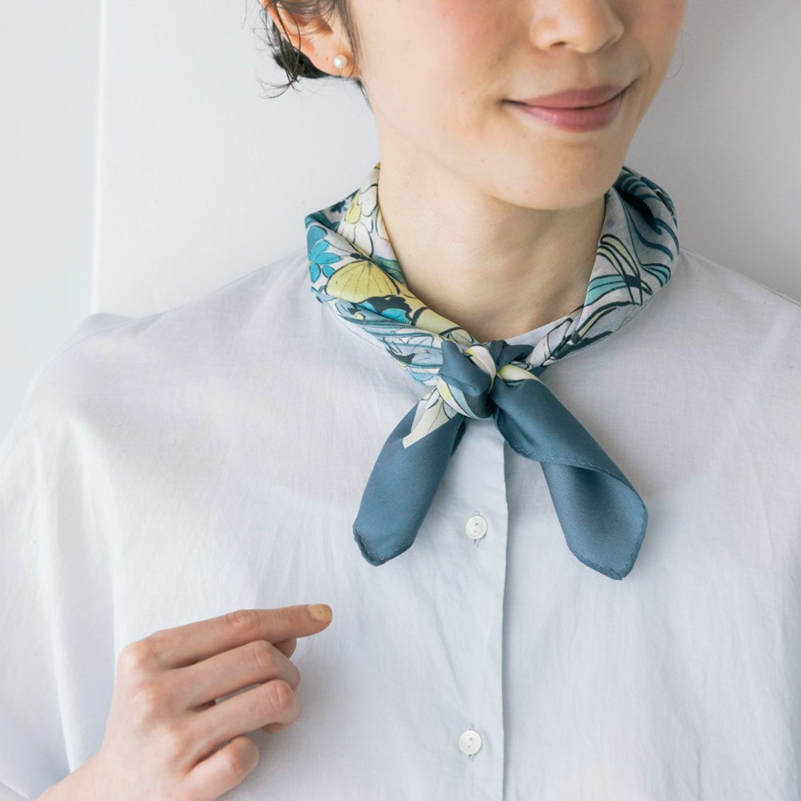 「日常に、ひとさじの憧れを」色づかいにこだわったシルクスカーフ / bird garden(ブルー、ベージュ)