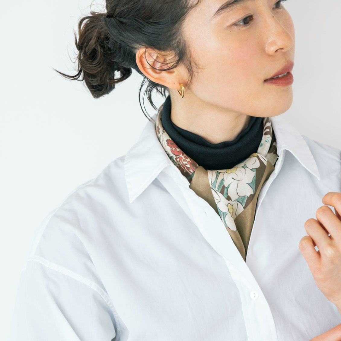 チラッとスカーフの裏面が見えていてもほとんど気にならず、気楽に巻けるのも助かるところです。