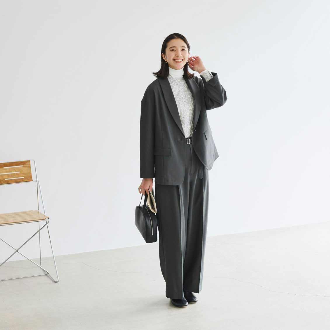 大事な商談や行事がある日はセットアップで。ドレスコードに迷う日も、ジャケットとセットで持っているという安心感から緊張も和らぎそうです。