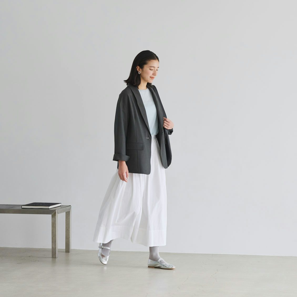 ボタンは軽やかに1つだけ。パンツ・スカートどちらでもバランスが取りやすいよう、着丈はやや長めです。