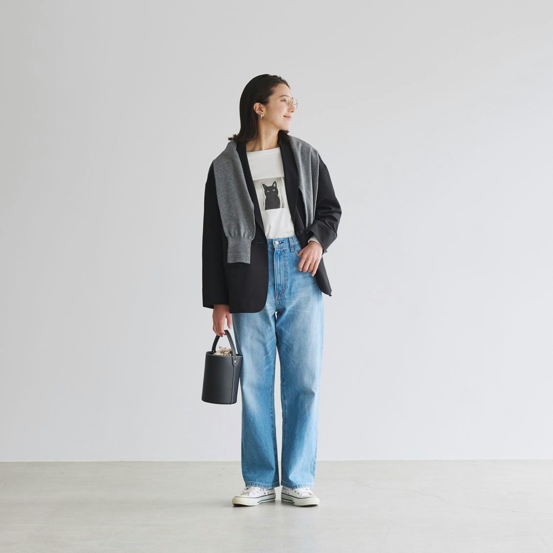 デニムにTシャツというとことんカジュアルな装いも、ジャケットを羽織るだけできちんと感がほんのり漂うコーデに。