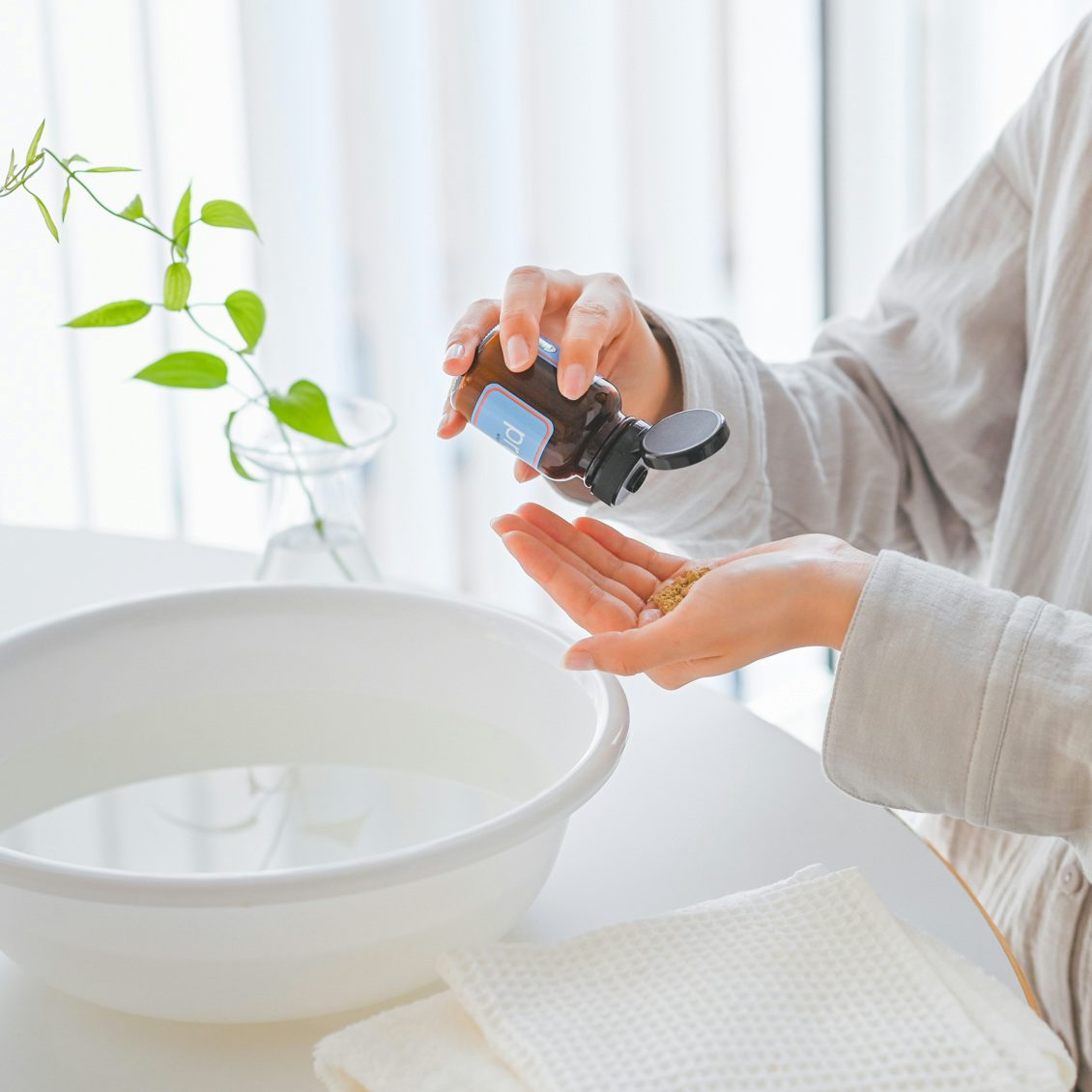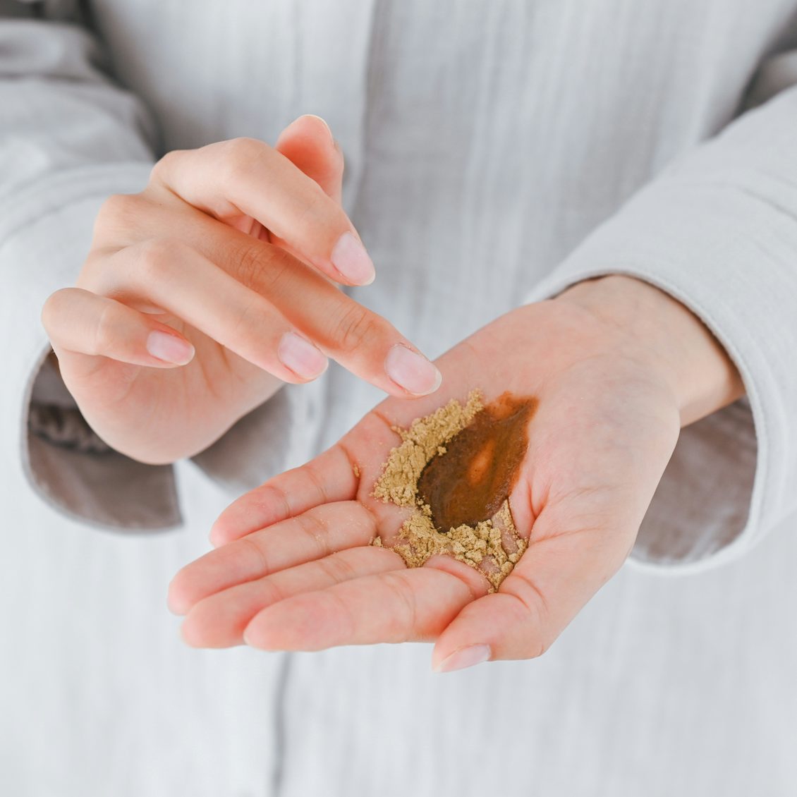STEP1: 小さじ1杯程度を手のひらに取り、少しずつ水を加え混ぜて滑らかなペースト状にします。 ダマになった場合は、さらに少しずつ水を足して調節してください。