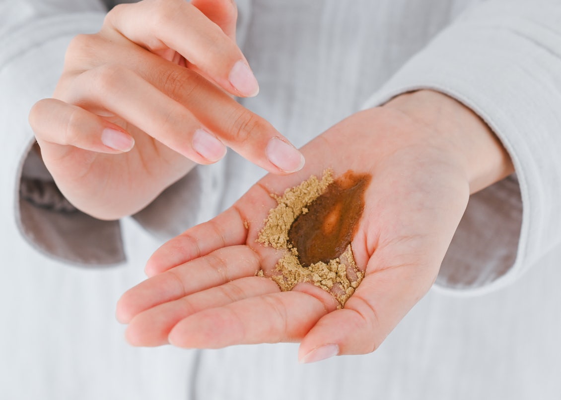 100%天然由来のハーブのみで構成されたパウダーに水を含ませ、ペースト状にしたらくるくると顔の表面をマッサージ。