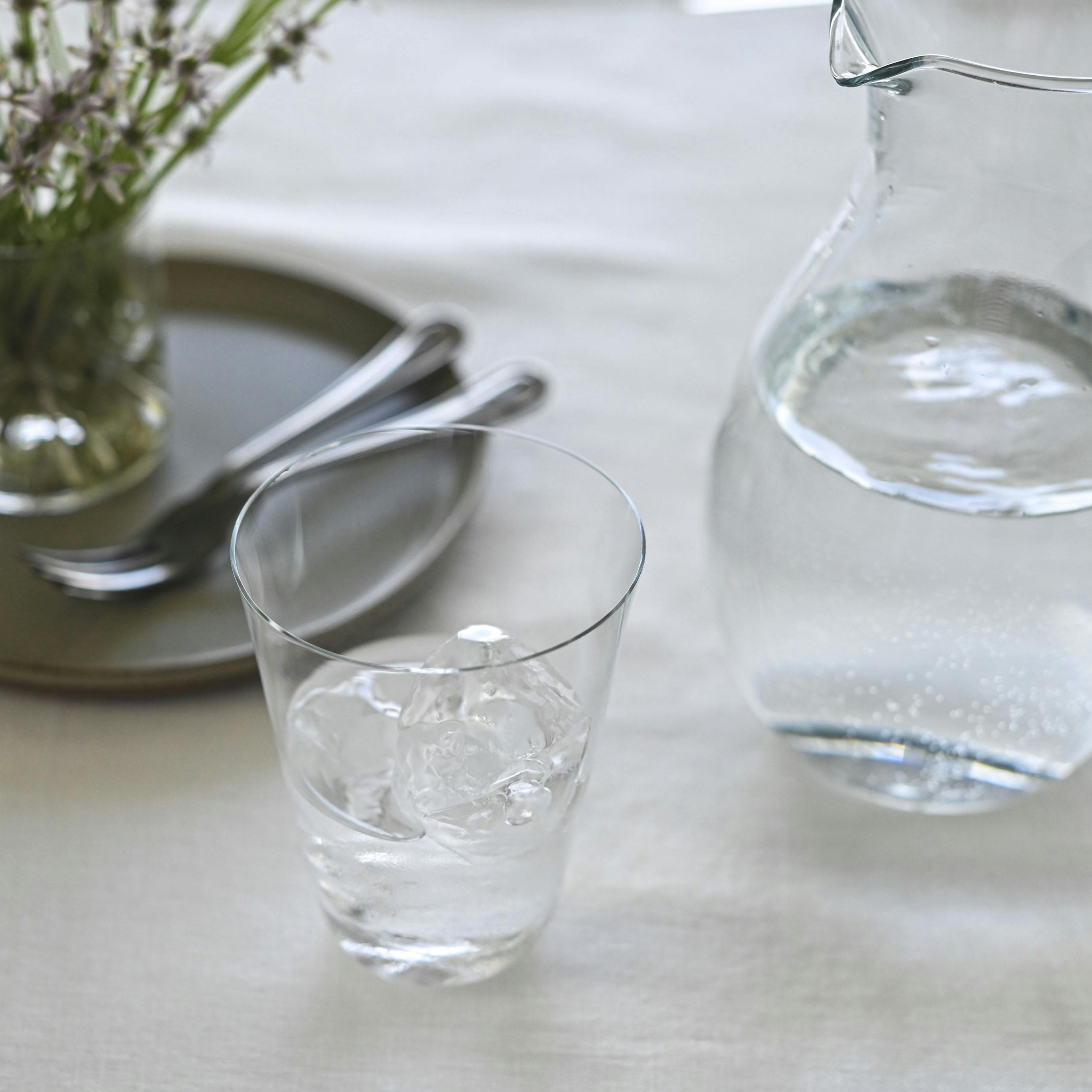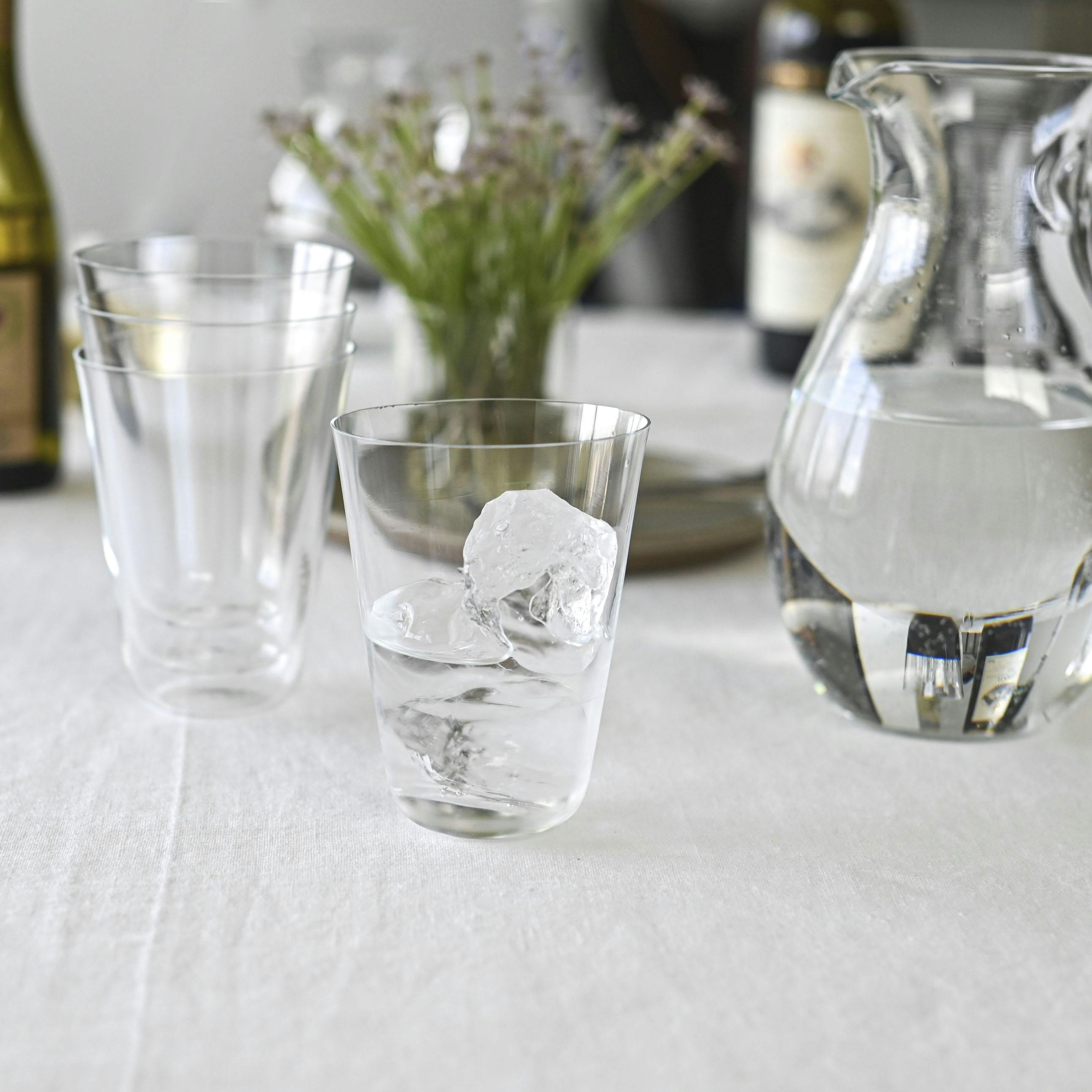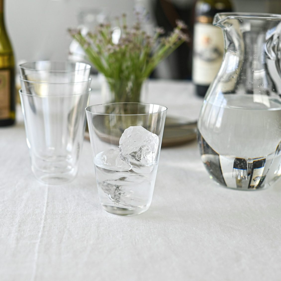 薄く透明なガラスの儚い佇まいも、このグラスの魅力。氷がカランとあたる音は涼しげで、飲み物の色もきれいに映ります。