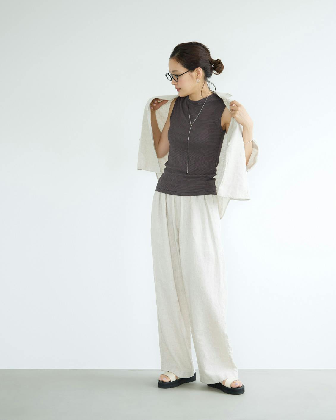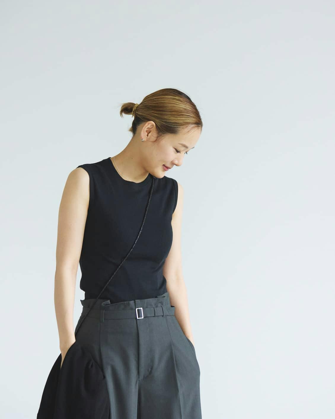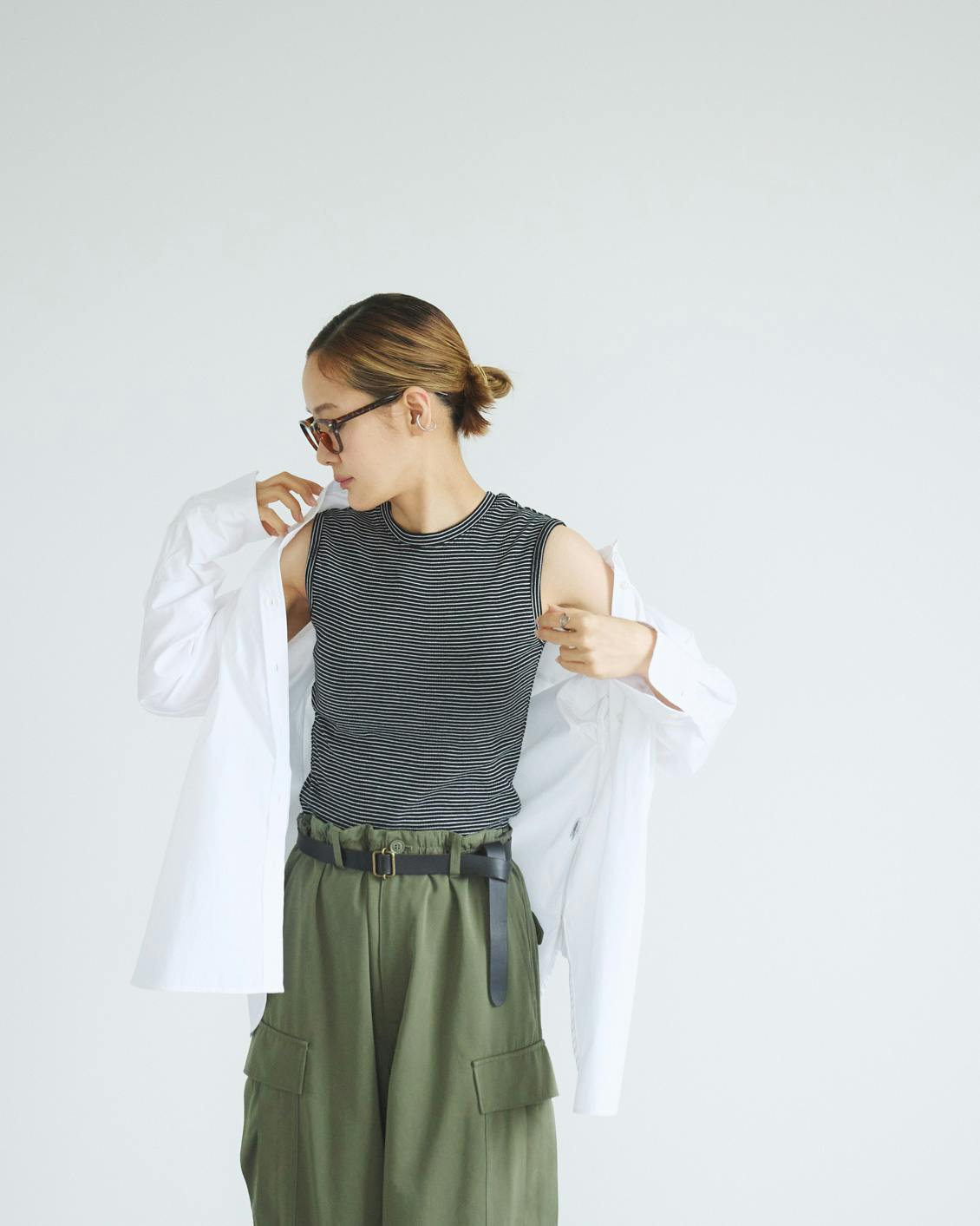 このタンクトップは重ね着コーデでこそ、その威力を一番に発揮してくれるアイテム。