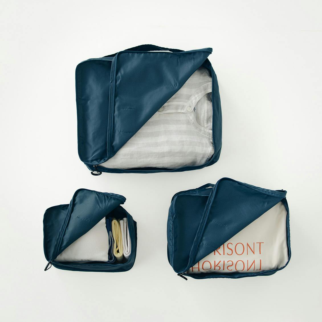 サイズや形が異なるものも、ざくざく収納できる から整理が苦手な方でもパッキングが楽々。