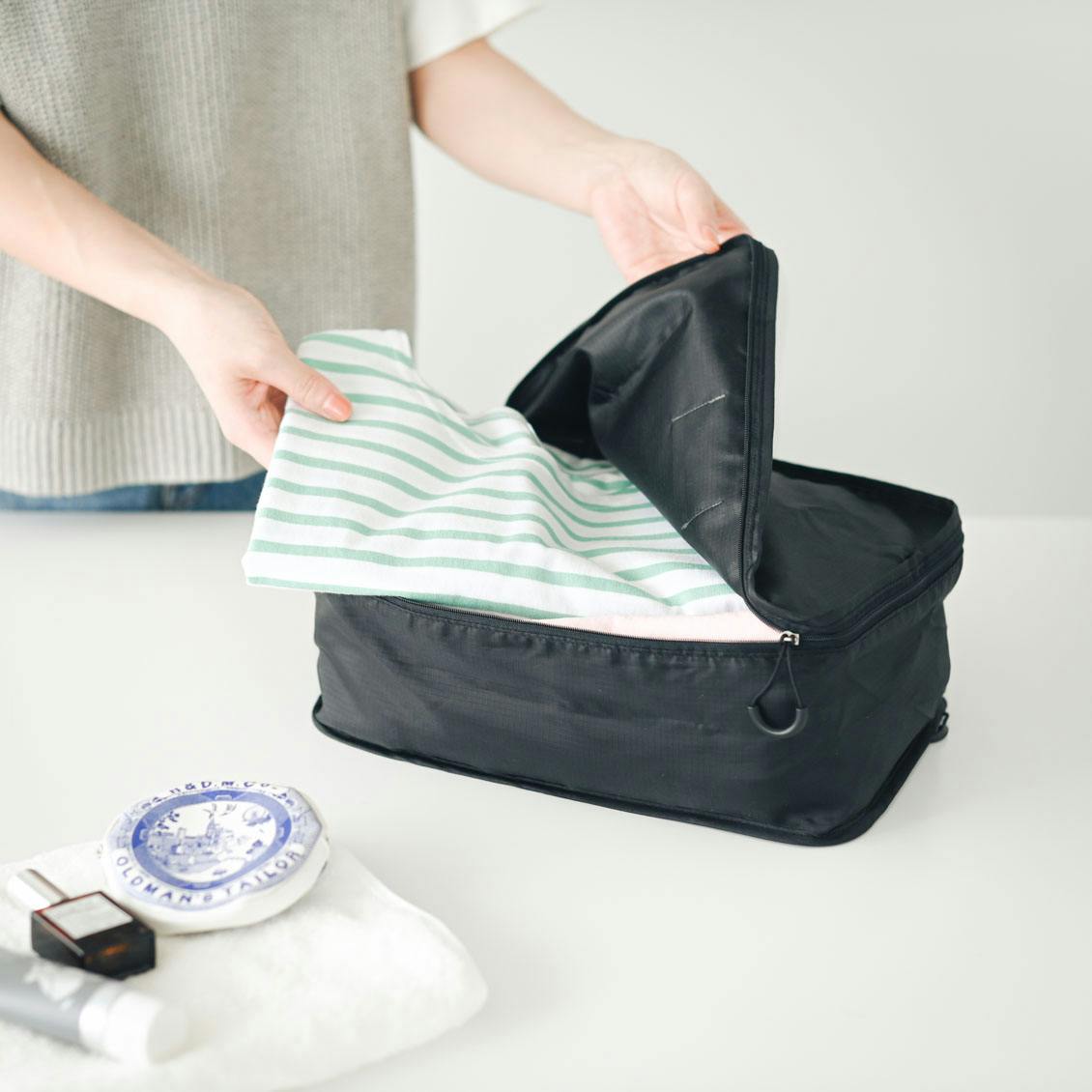 旅先が決まったら、早速荷づくりスタート。この仕分けケースはマチが深く立体的 。