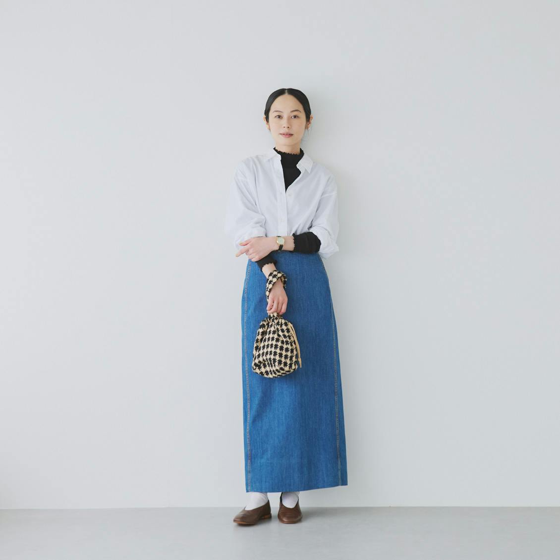 形はとことんシンプル。それでもコーデが味気なくならないのは、襟・袖・裾のデザインが効いているから。