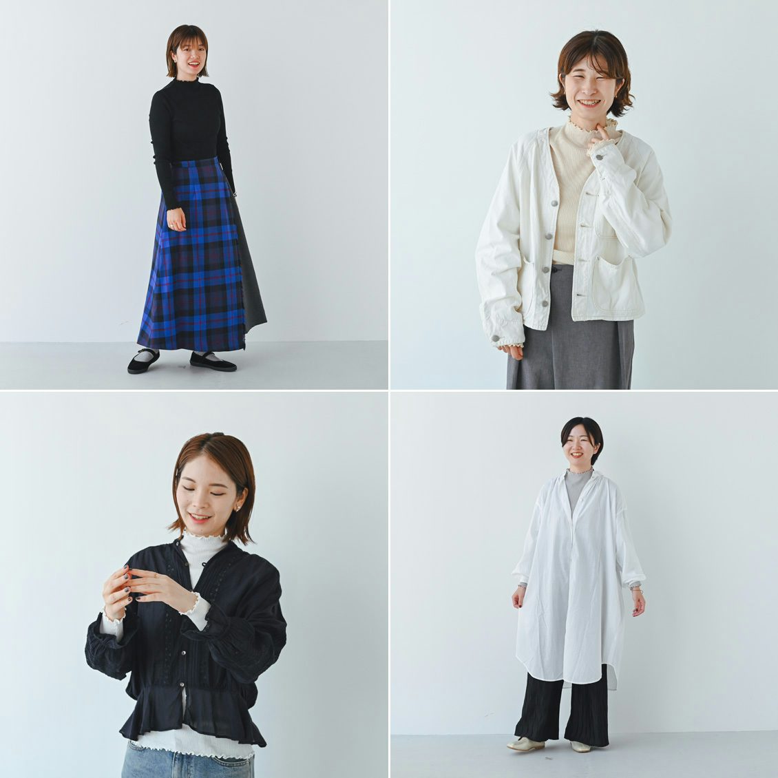 身長155cm、160cm、164cm、167cmのスタッフが着用してみました。丈感やコーディネートの参考にご覧ください。