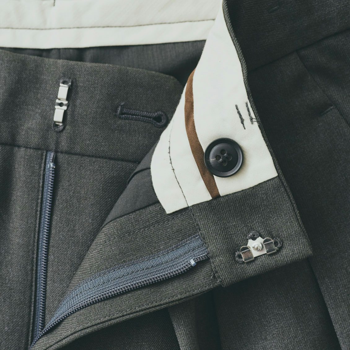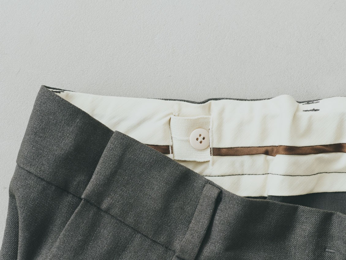 センタープレスは形状記憶させず、あえてヒップにかけて緩やかになるように仕上げました。これによりカジュアルな装いにもマッチしつつ、ラフすぎない印象になります。