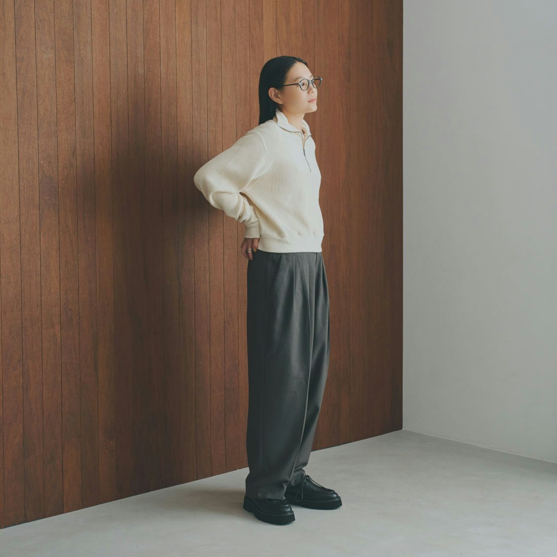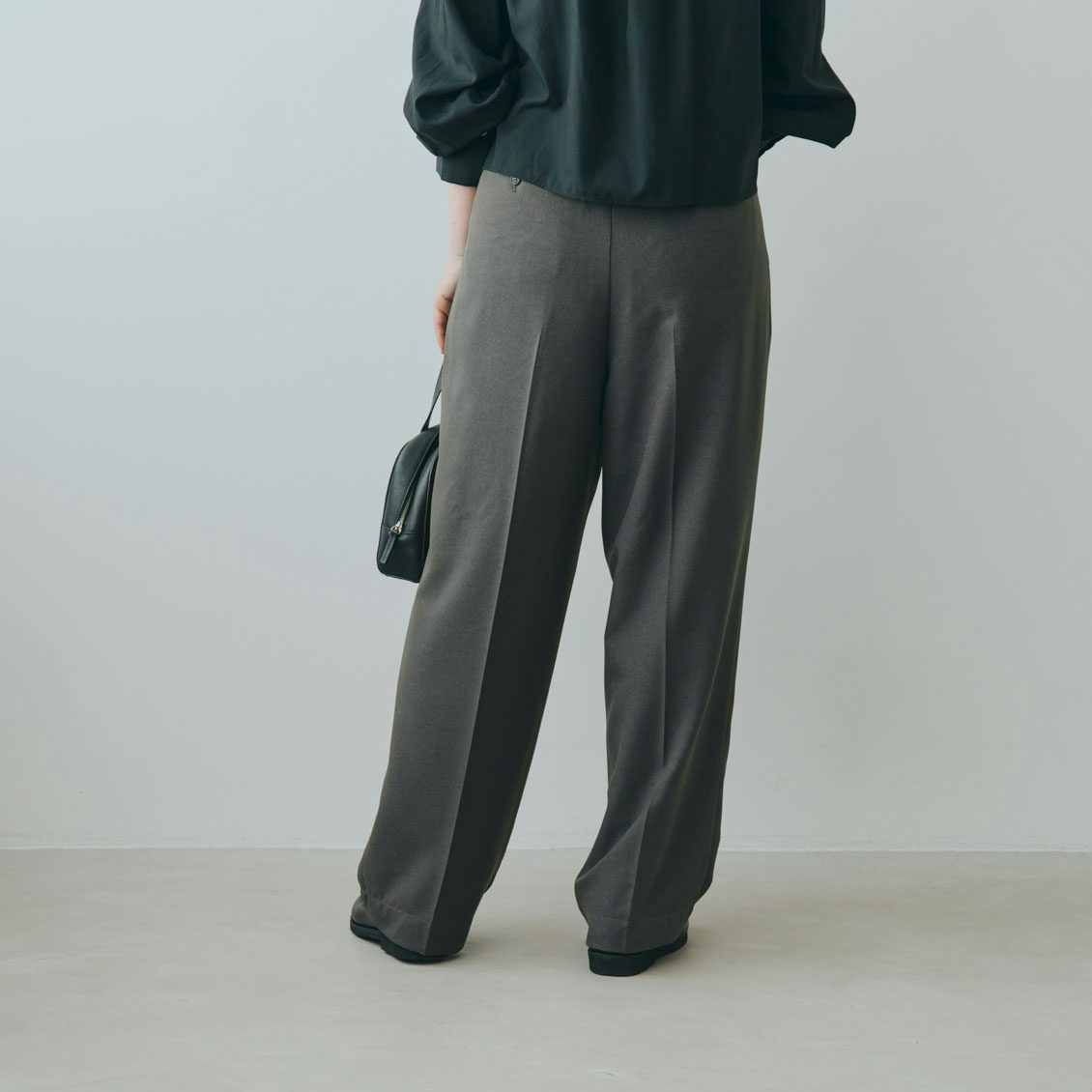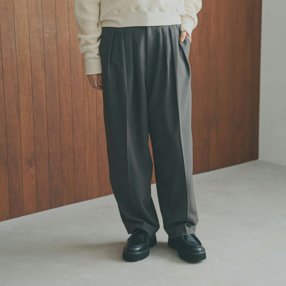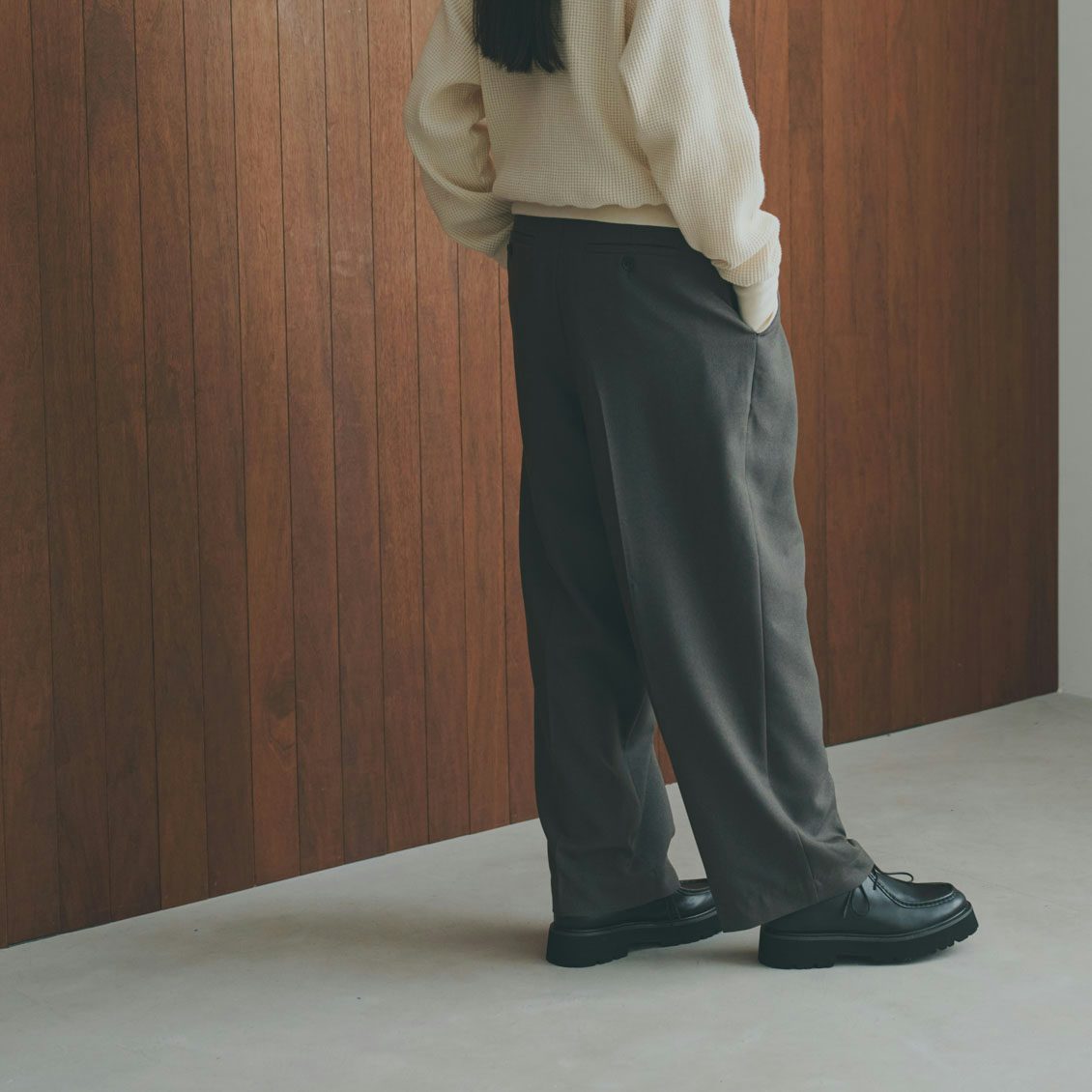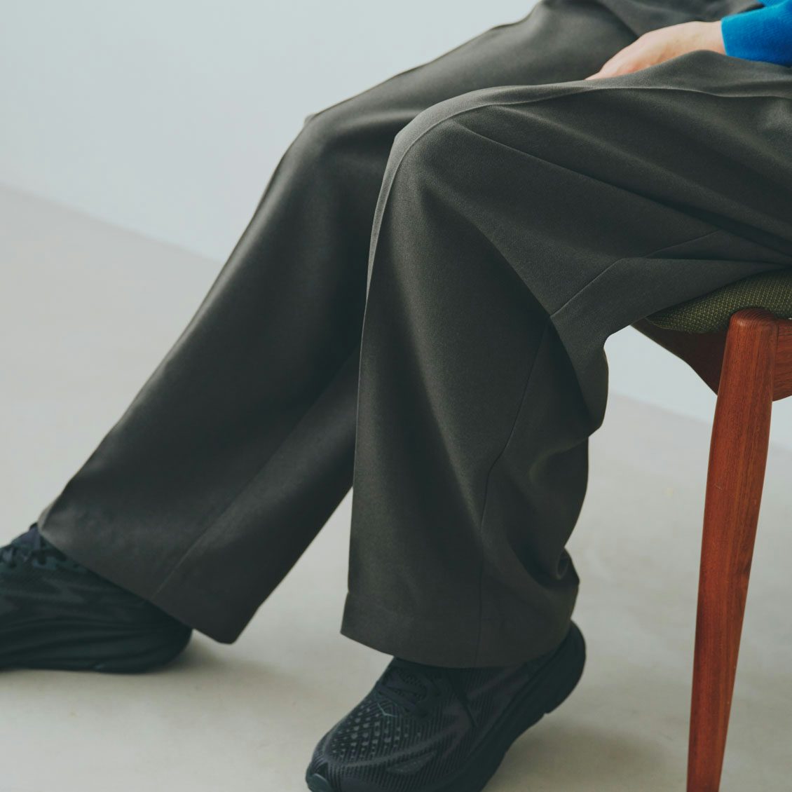 ボトムス選びで気になるあれこれをシルエットの細部に反映し、出来上がったのがセンタープレスとツータックの入った、ワイドパンツです。