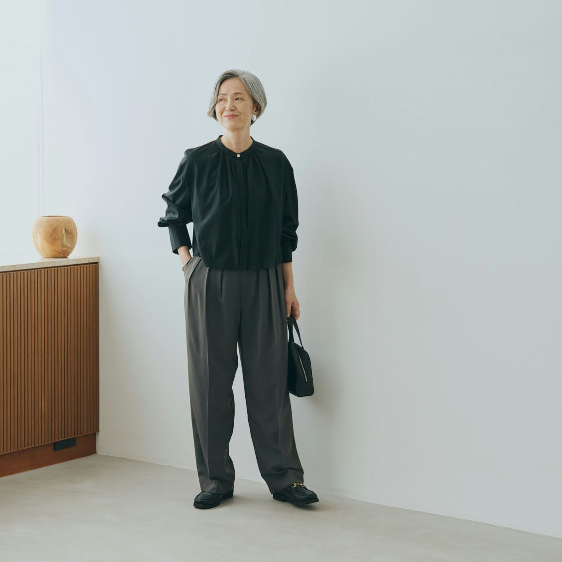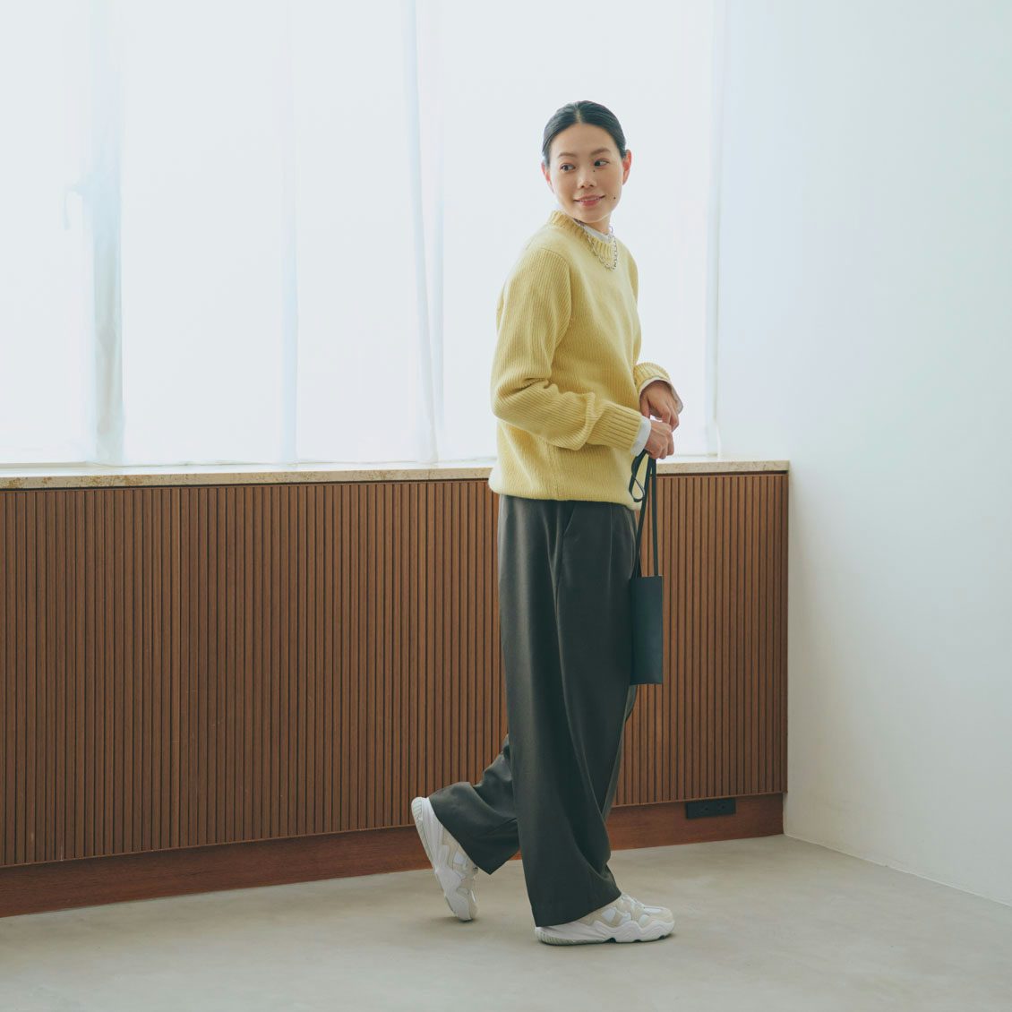 裾幅を少し絞ってあるのもミソ。この工夫でシルエットが洗練され、落ち着いた大人の装いに見せてくれるんです。