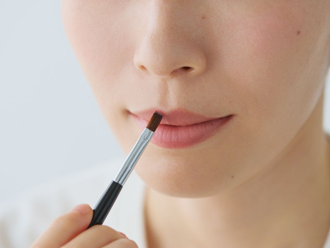四角いブラシの角を使い、唇の山の部分に沿わせるようにすると輪郭をきれいに描くことができます。