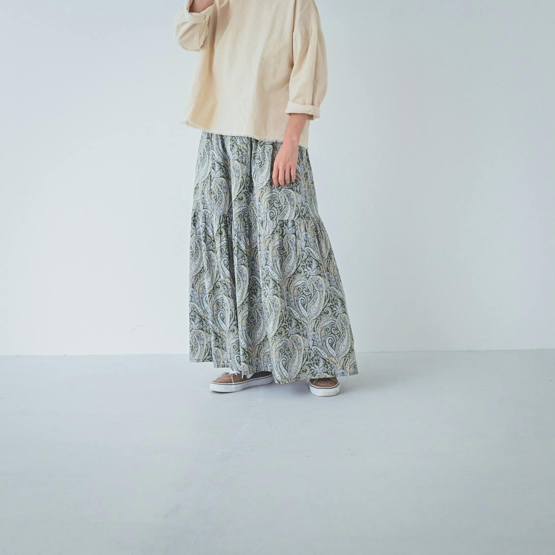 シンプルなギャザースカートや、華やかな柄パンツともまた違う「ペイズリー柄のティアードスカート」ならではの良さを味わっていただけたら。