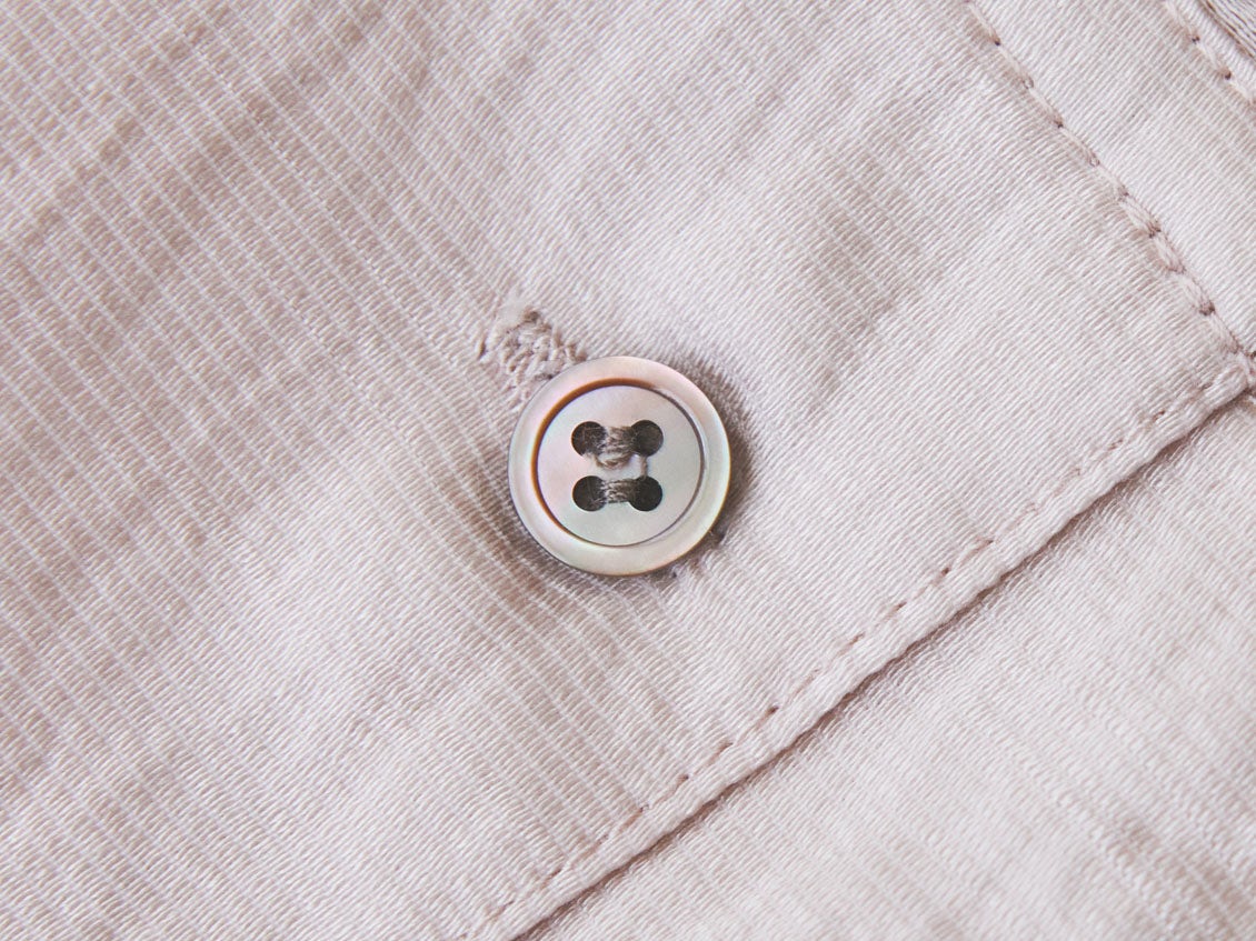 光沢感のある生地に合わせて、前立てにはきらりと光る貝ボタンをあしらいました。