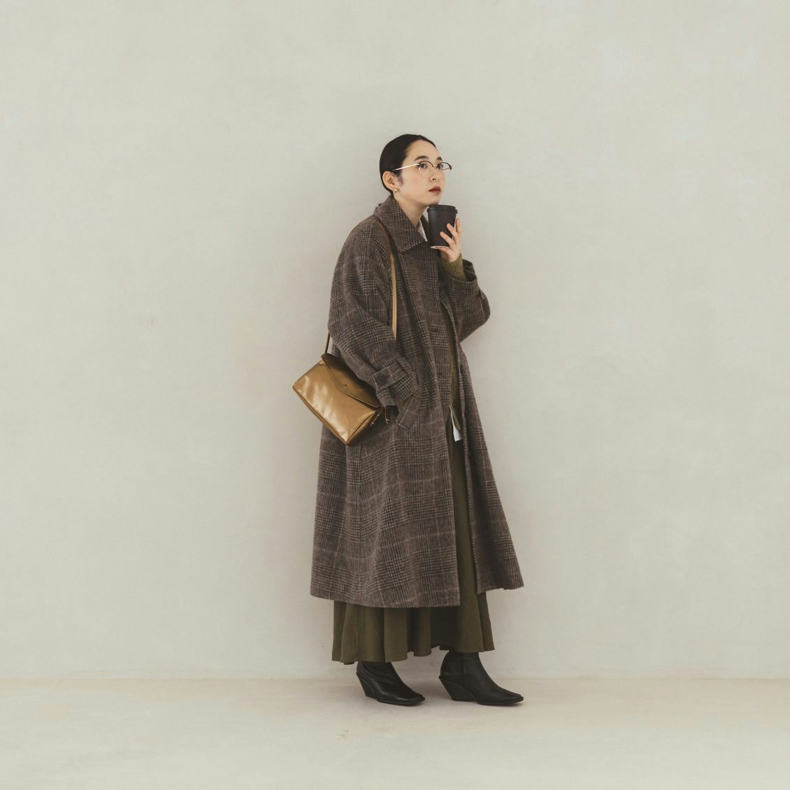 Aラインのロングコートは、ゆるっとした太めのボトムスとも好相性。ラフな着こなしもグッとお洒落にまとまる、チェック柄です。