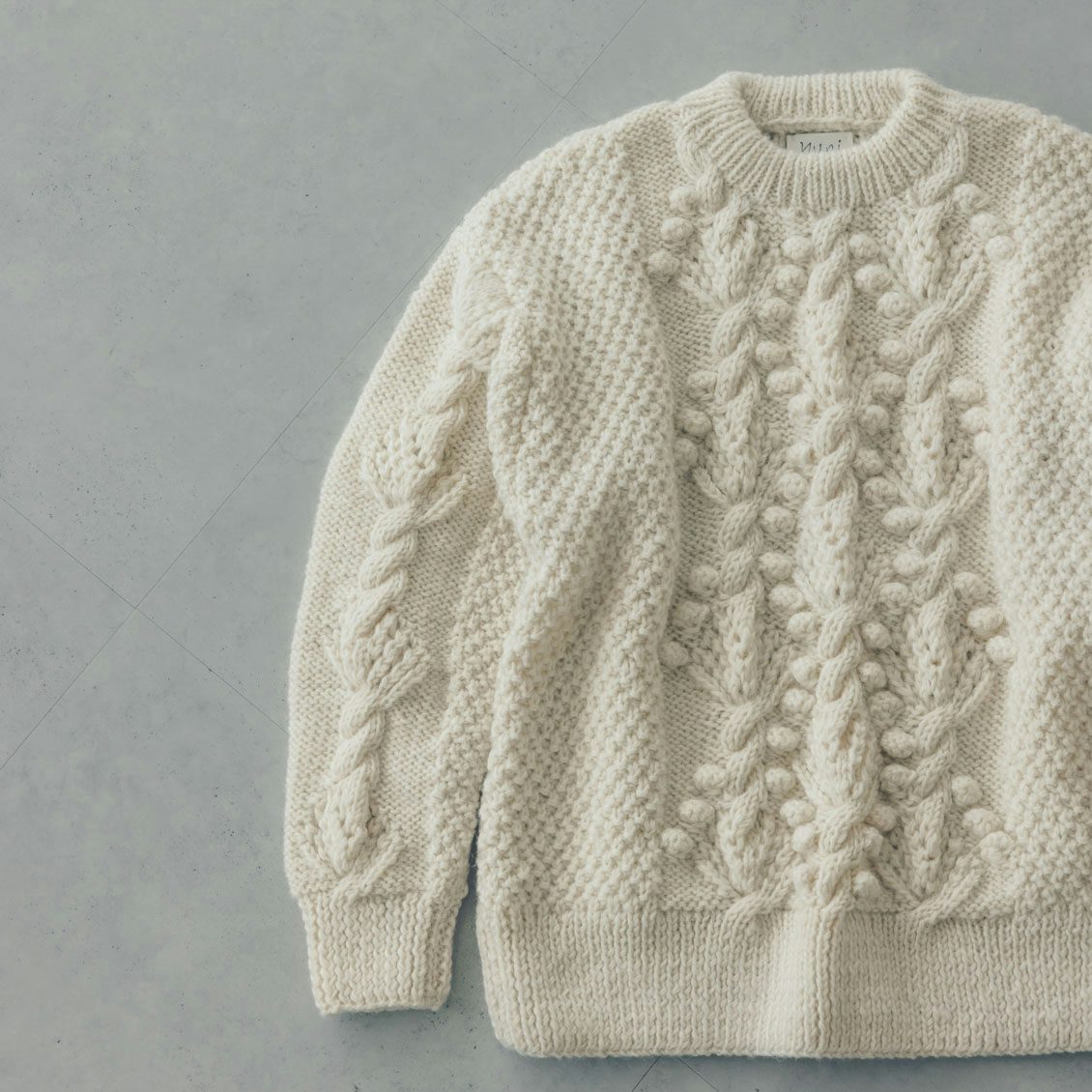太番手のウールのみで編むその作りは、強風が吹くアイルランドの海から漁師たちが身を守るために着ていたアランニットと同じ。