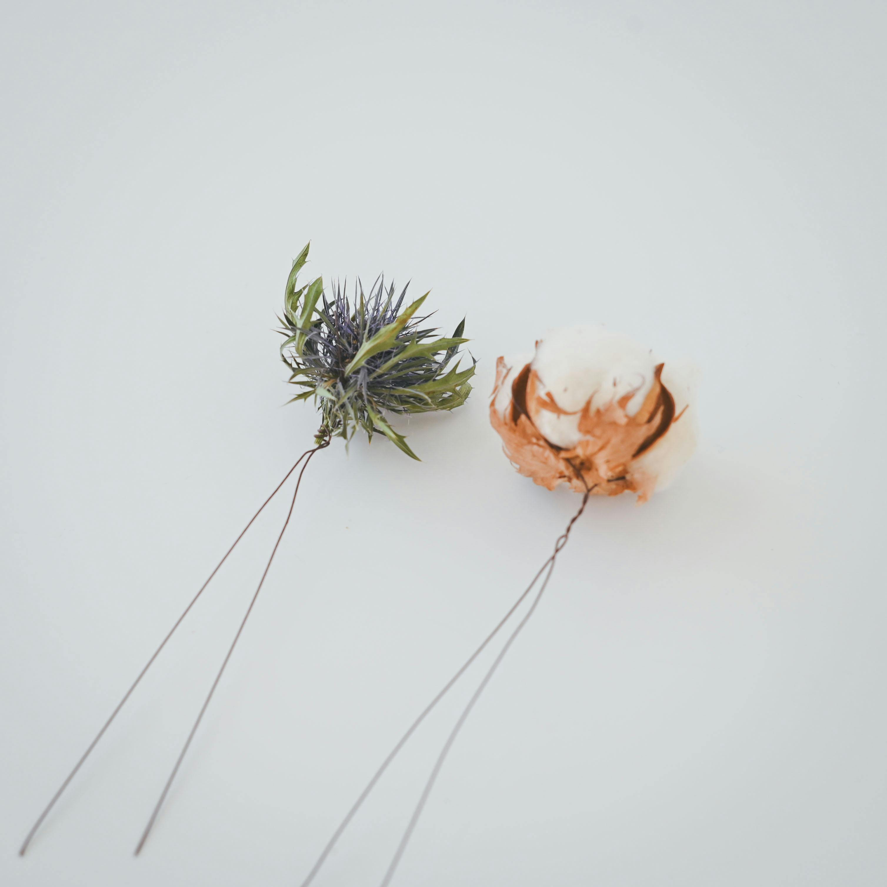 ワタの実とエリンジュームは、Uの字にしたワイヤーを花びらにひっかけます。