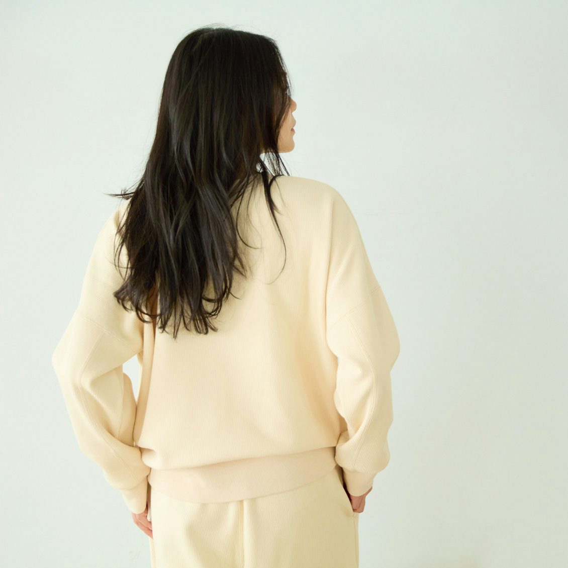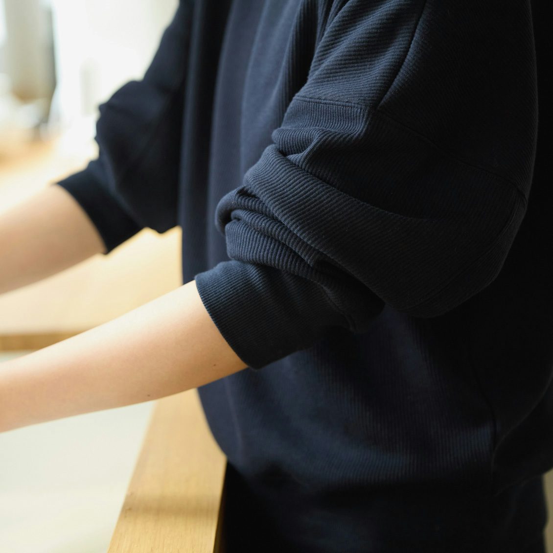 裾や袖口のリブでメリハリをつけることでダボっとせず、品の良さが漂う形に仕上がりました。