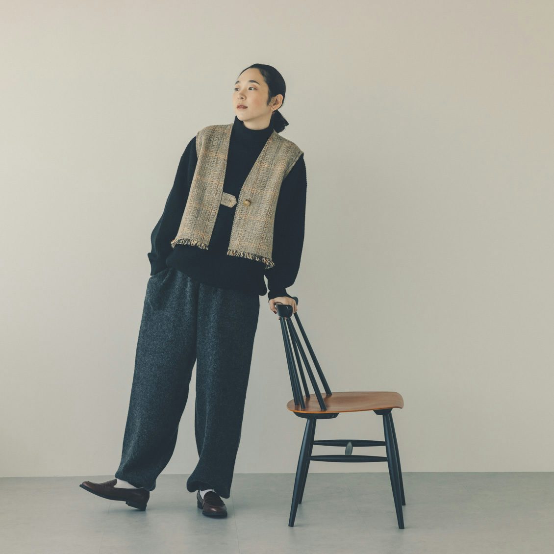 もしもクローゼットの中に、ピタッとしすぎて着られなくなってしまったハイネックニットが眠っていたらぜひ、このベストを合わせてみてください。