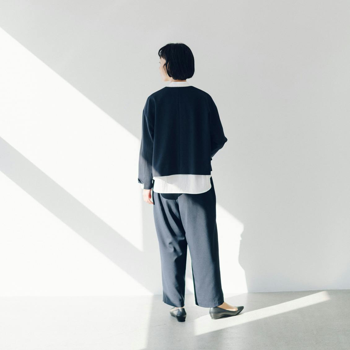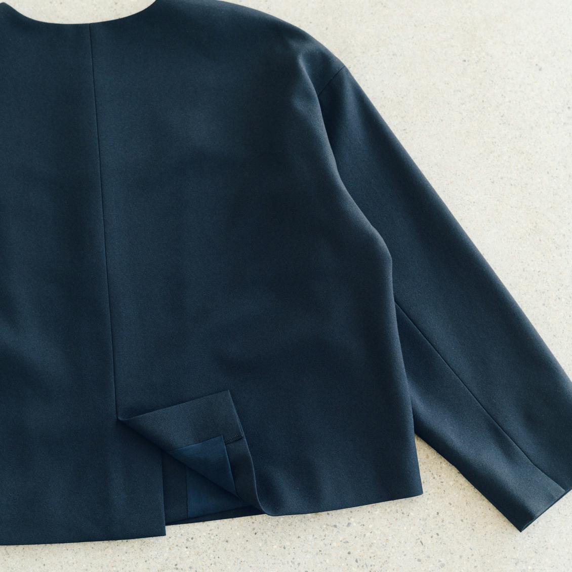 首にそっと沿うノーカラーの襟元は、全身の印象を引き締め、きちんと感もアップ。見た目よりゆったりした着心地なので、窮屈さは感じません。