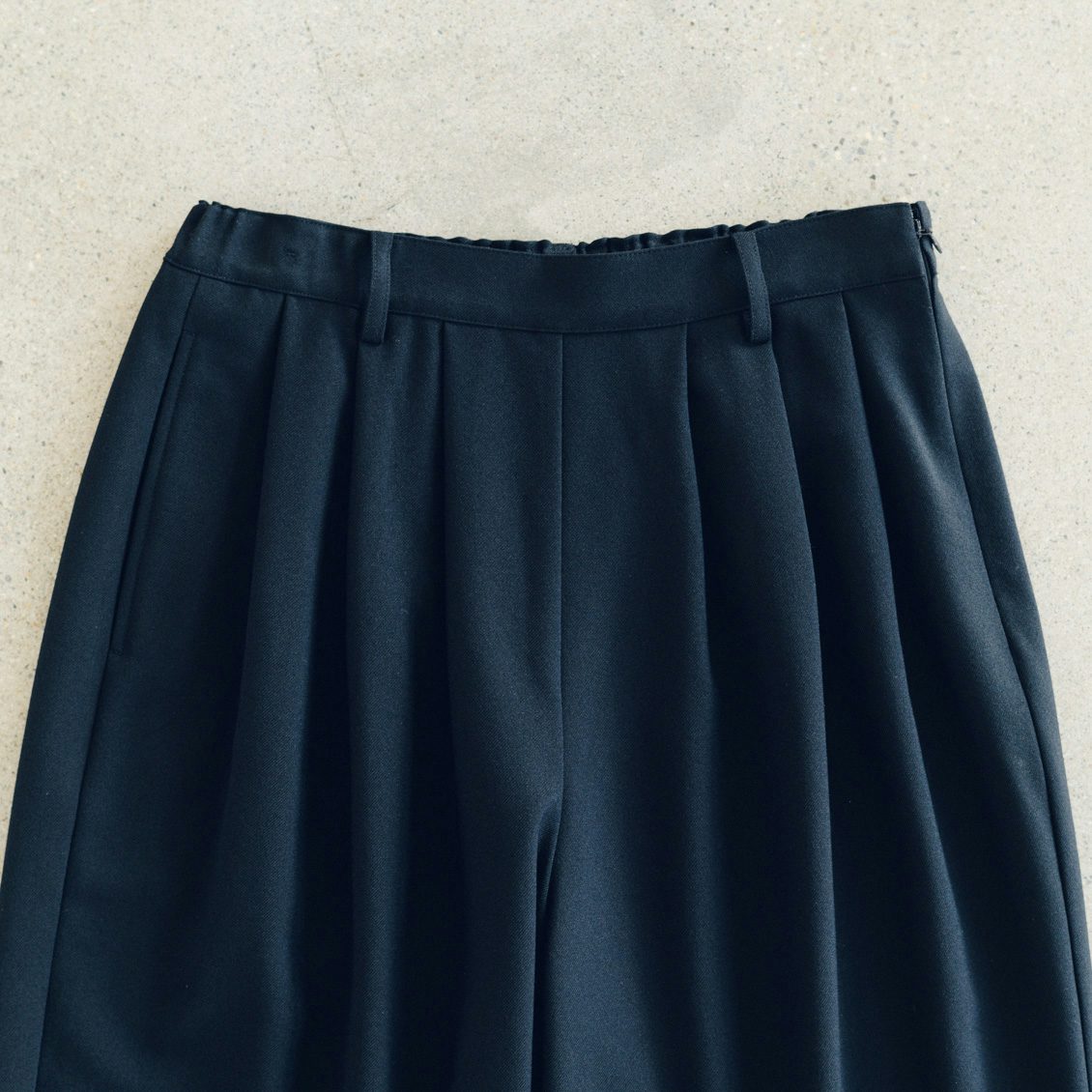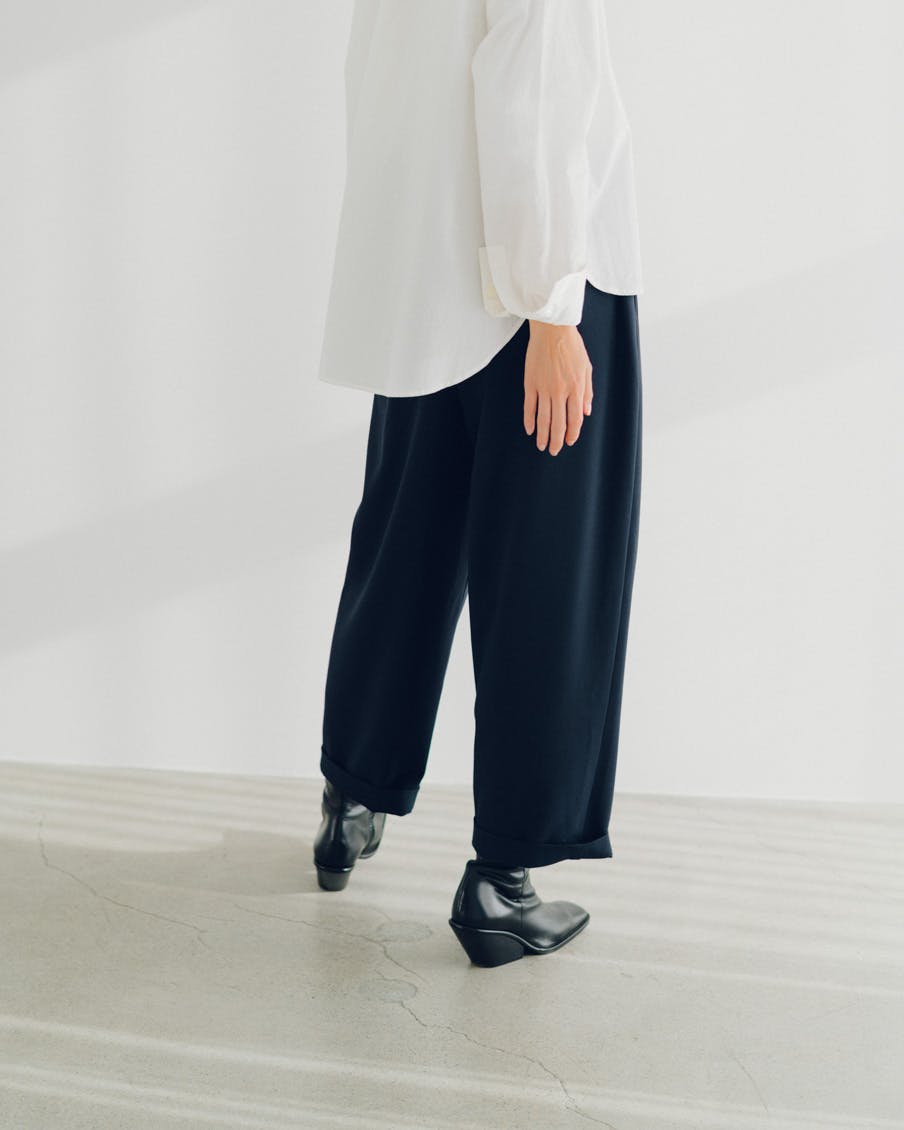 前面に綺麗なドレープが出るよう計算されたタックは、シンプルにそのまま着こなして美しく、下半身周りの悩みも目立たないよう上手にカバー。