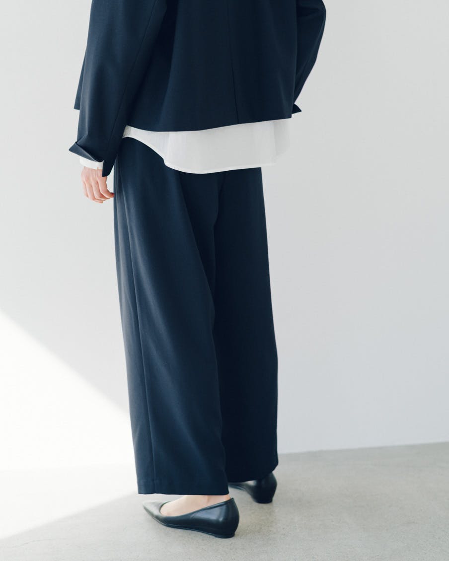 前面にはタックを入れ、太ももや下腹、腰回りの張り感を軽減。立ち座りが多い場面でも突っ張らず、ふとした瞬間のスタイルも気になりません。