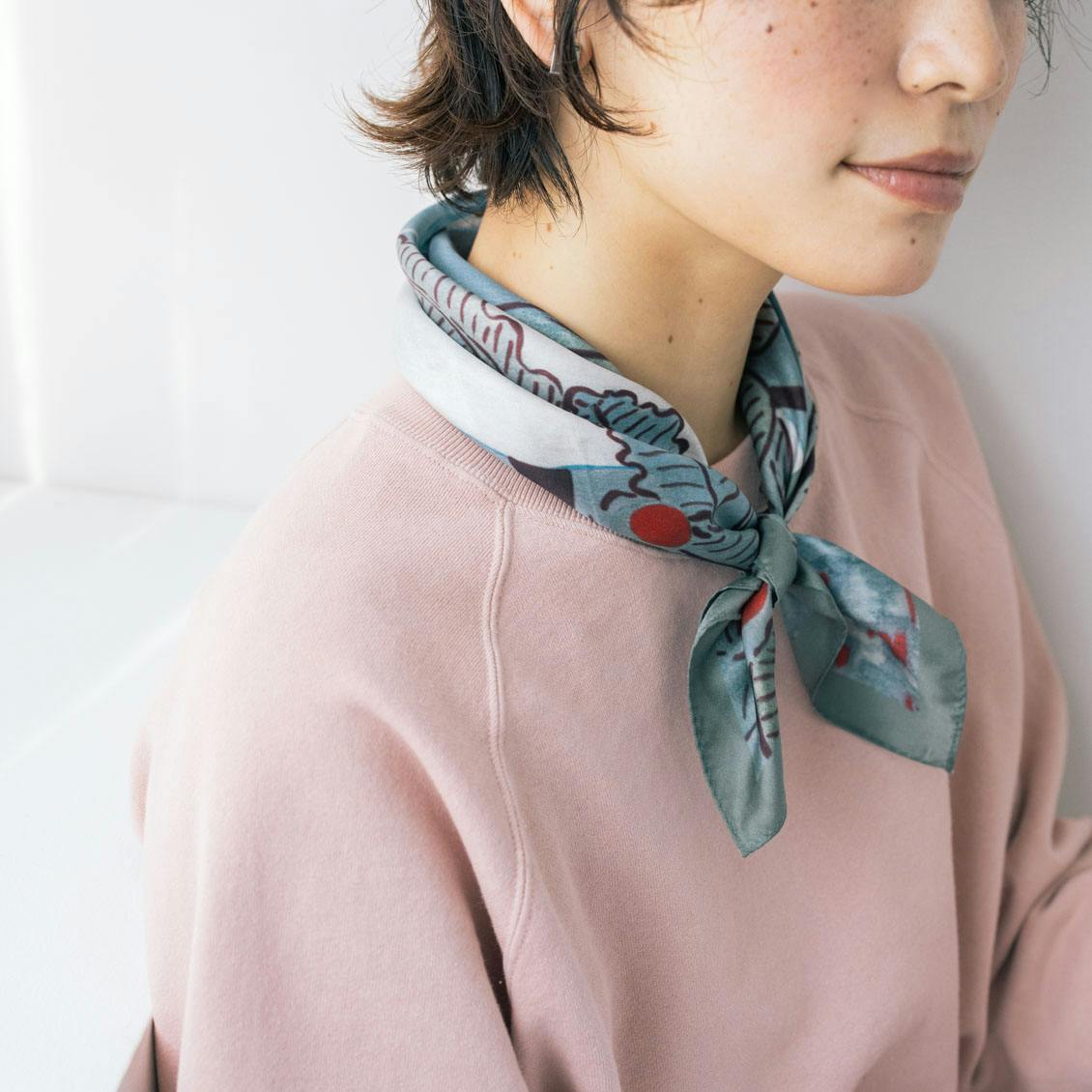 スカーフの角付近の対角線上に、同じ色合いの差し色を配置しているのも工夫のひとつ。