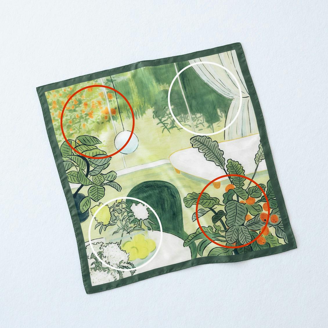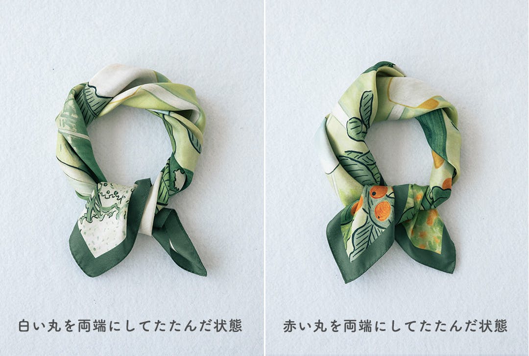そしてこちらのイラスト、スカーフを巻いたときに色柄の見え方が上手に決まるよう、その配置も緻密に計算されているんです。