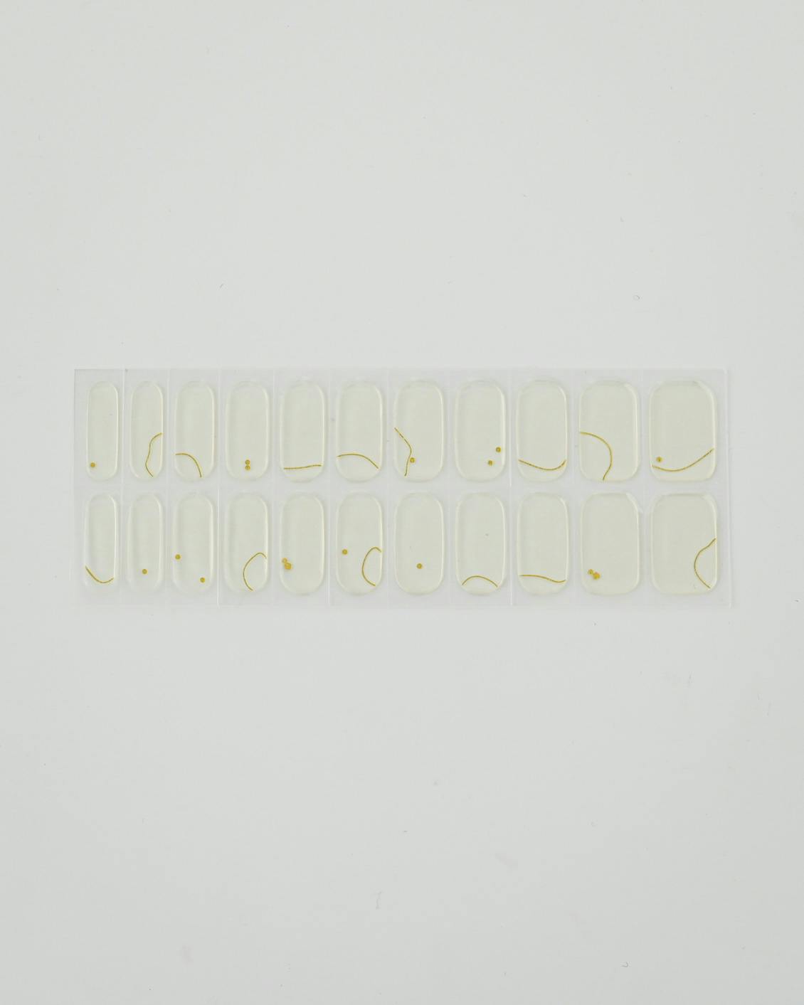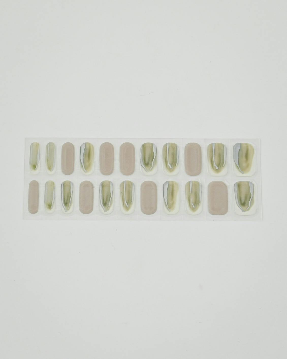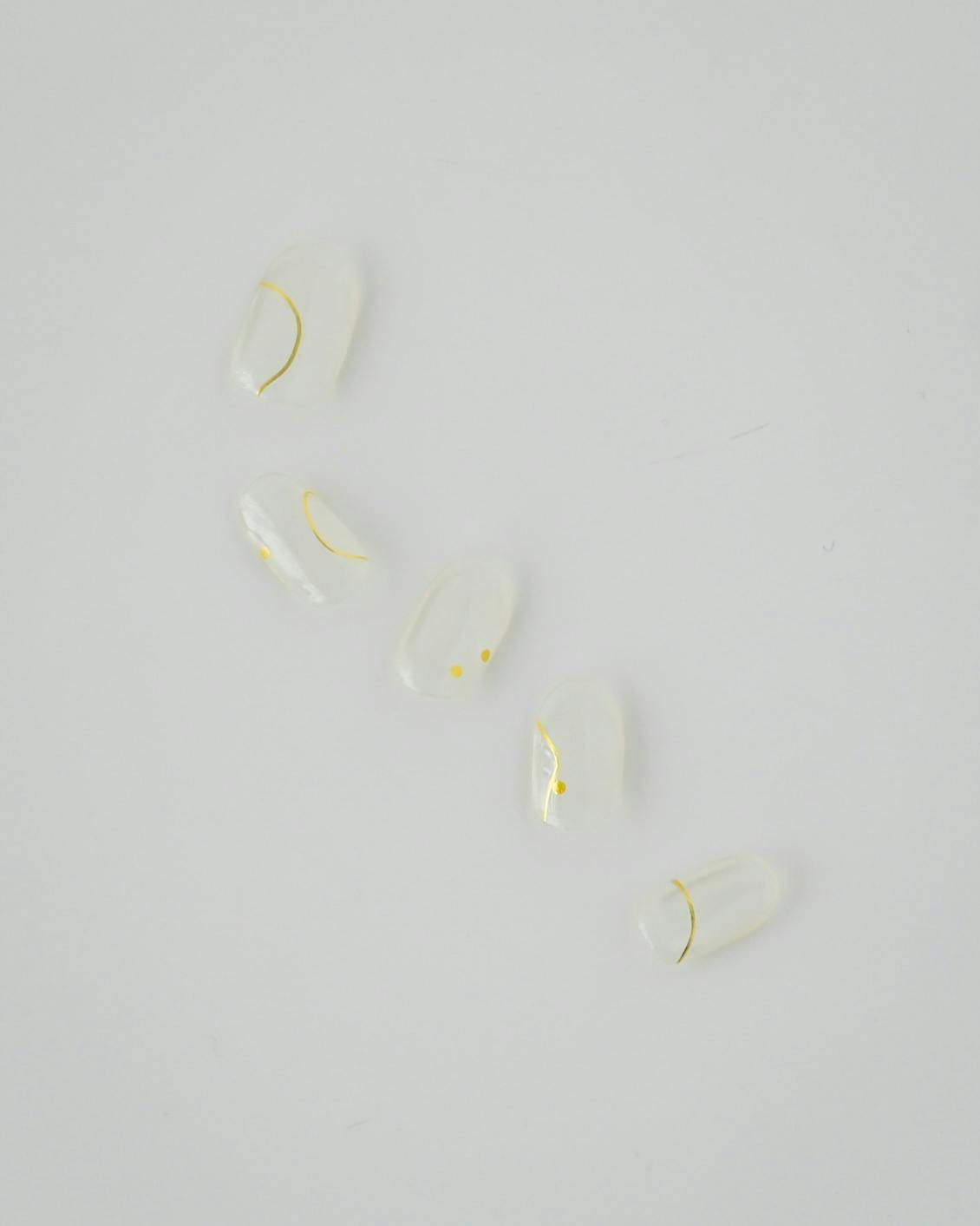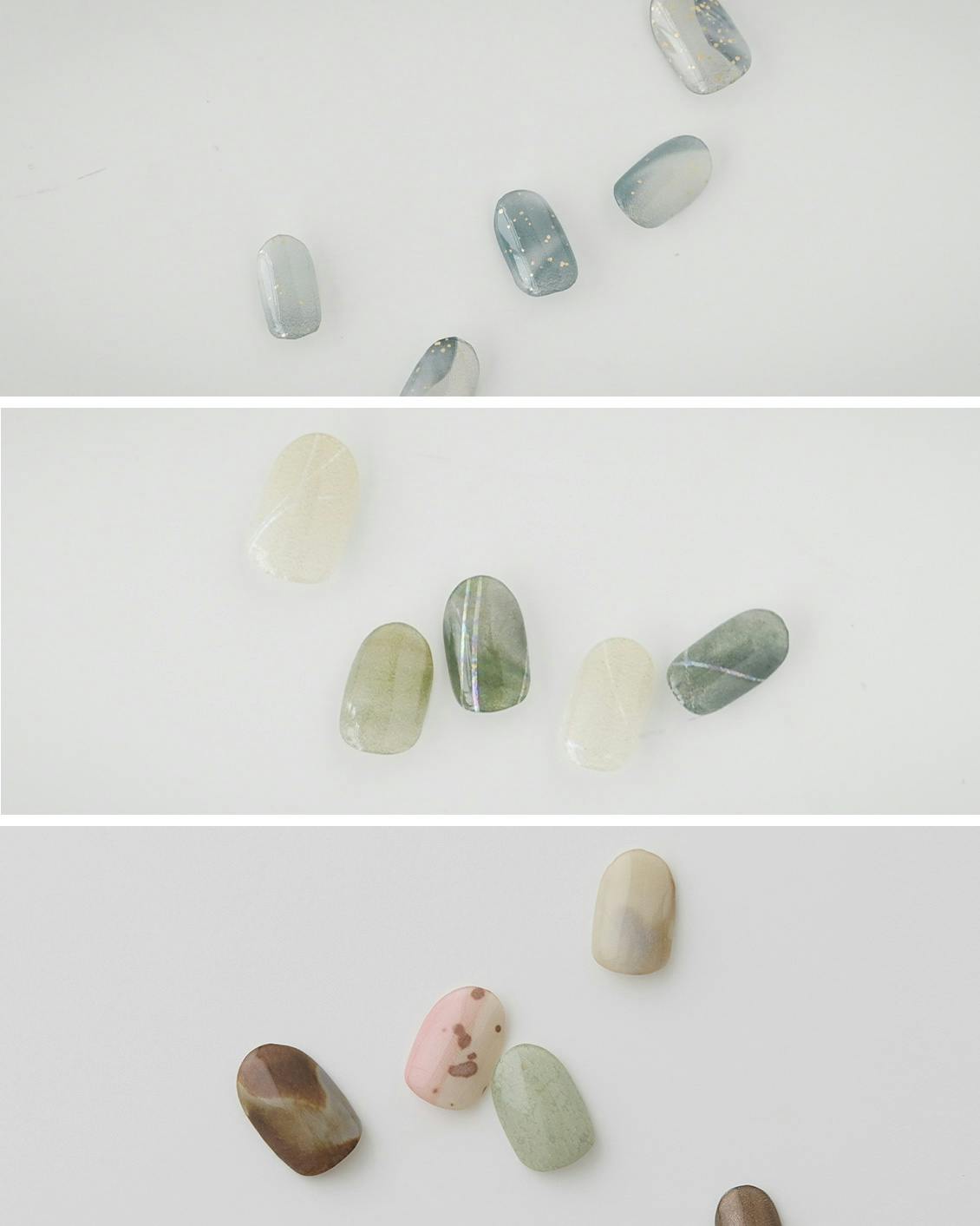 シルバーとゴールドのモチーフをリズミカルに配置し、シアーなセージカラーをアクセントに。地爪が透けるクリアベースです。