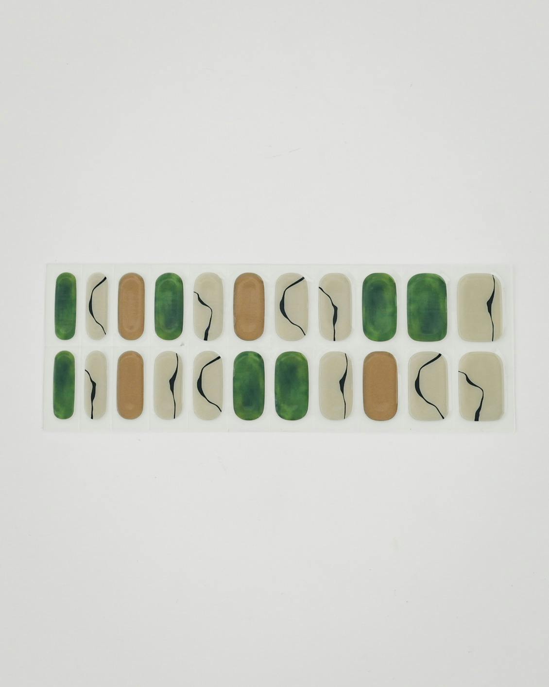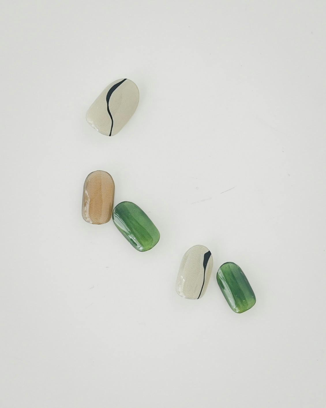 くすんだホワイトベージュとマーブルがかったグリーンの組み合わせ。そこに細い黒のラインが入ることで、全体がキュッと引き締まります。