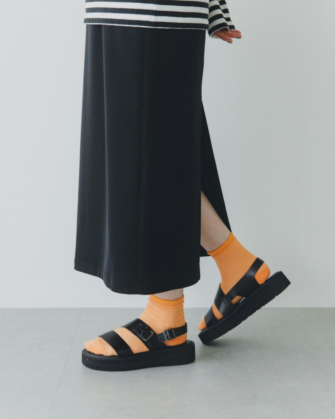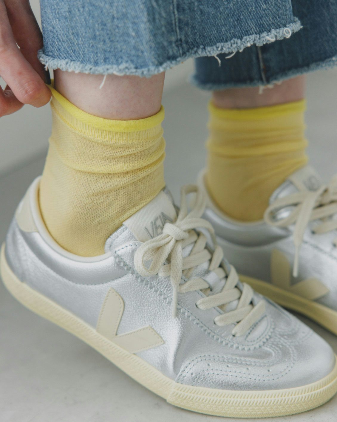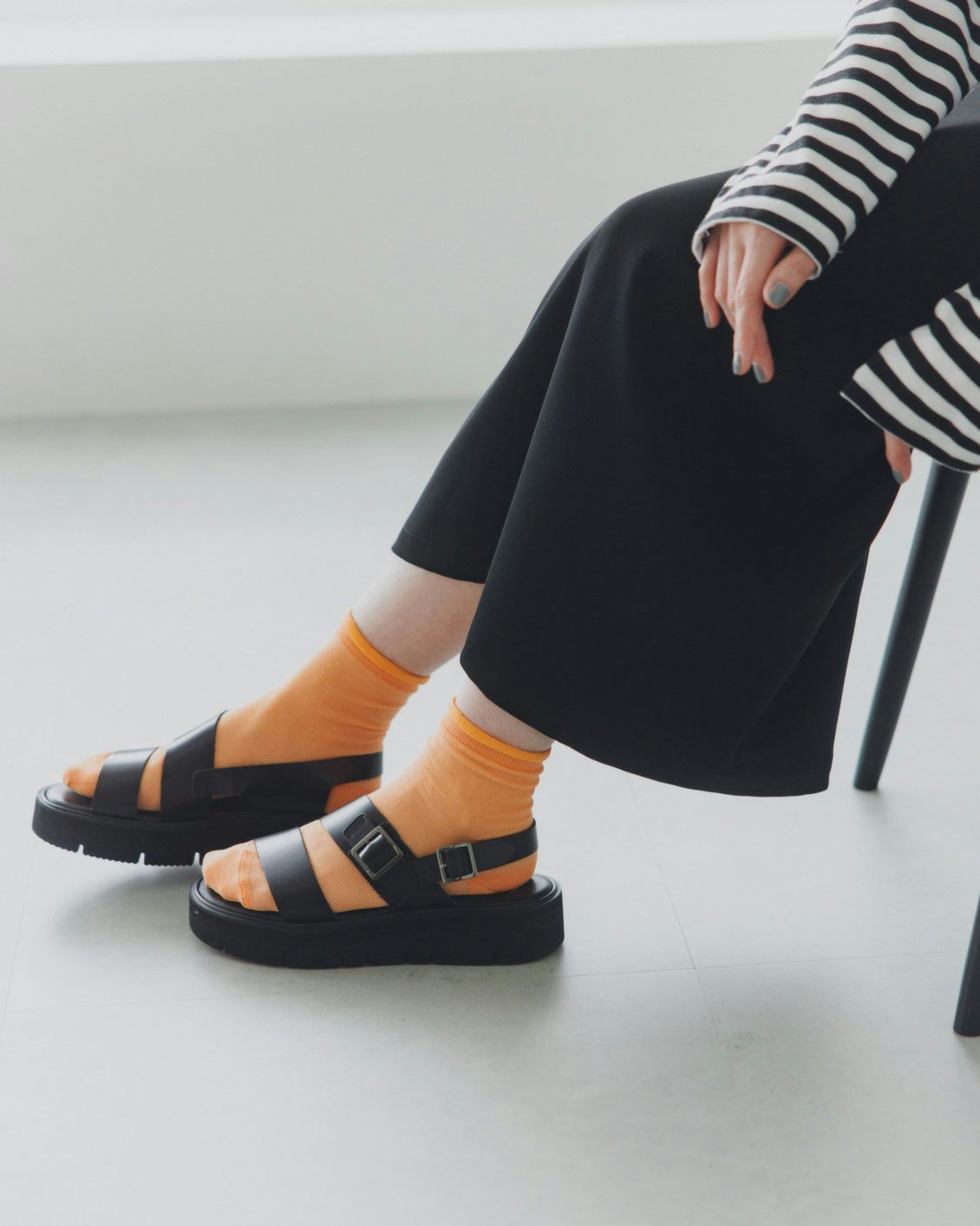 いつものスニーカー、革靴、サンダルに合わせるだけでコーディネートに抜け感が出て、一気に今らしくなるシアーソックス。