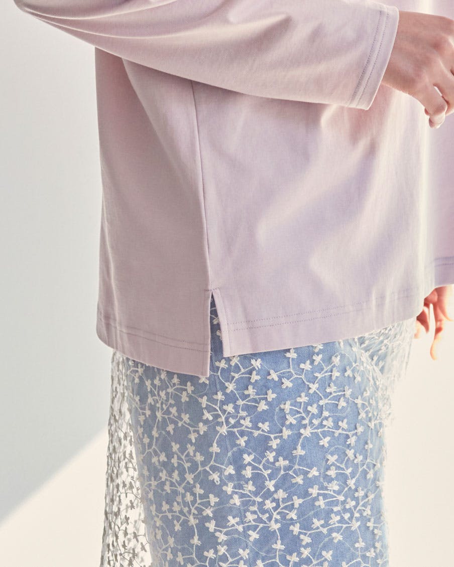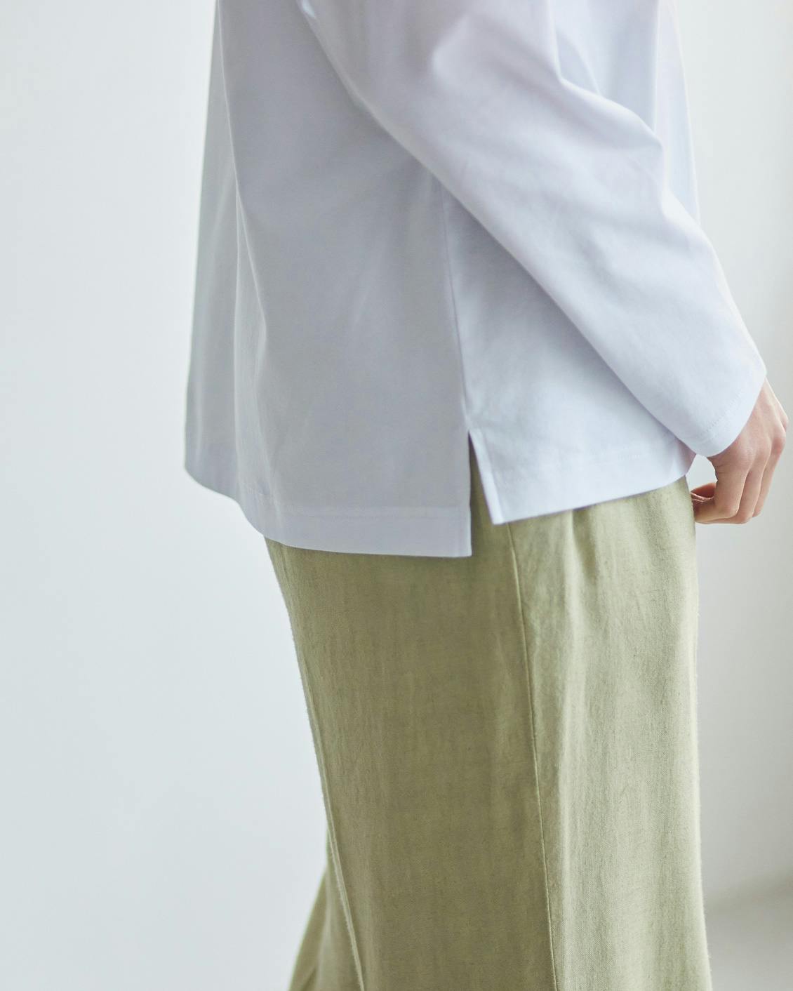 サイドにはスリットを入れてあるので、裾をボトムスにインしてもごわつきません。