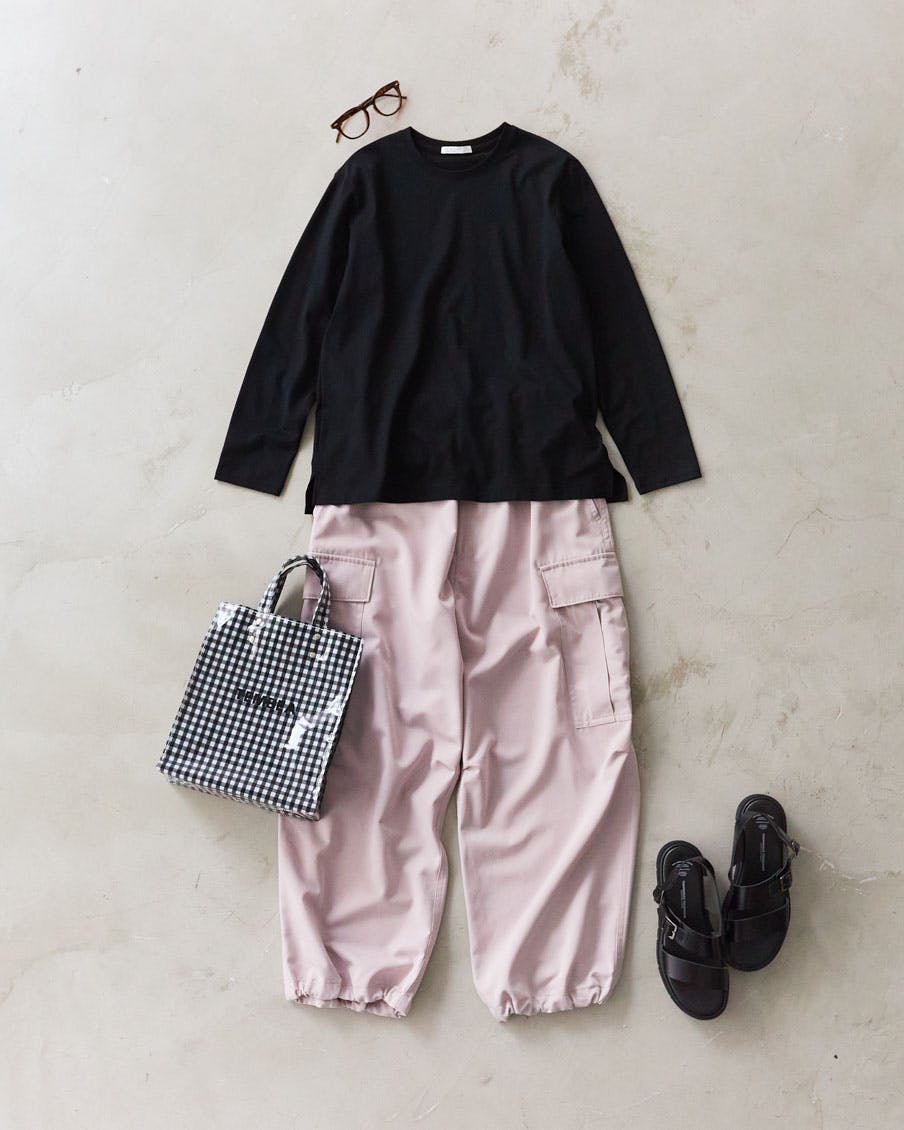 ちょっぴりきれいめ素材のボトムスと合わせて、シックにまとめるのも素敵です。