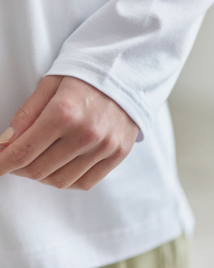 「Lサイズ」は着丈や袖の長さが長く、身幅もMサイズよりゆったりとした作り。サラリと一枚でも楽しみやすいサイズ感になっています。