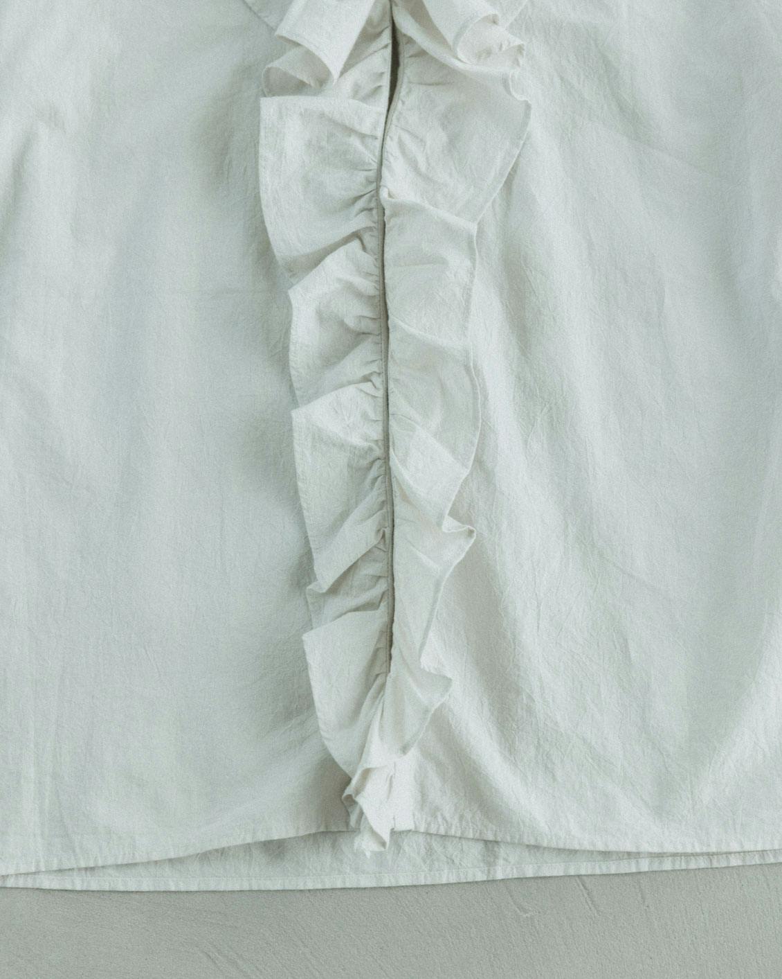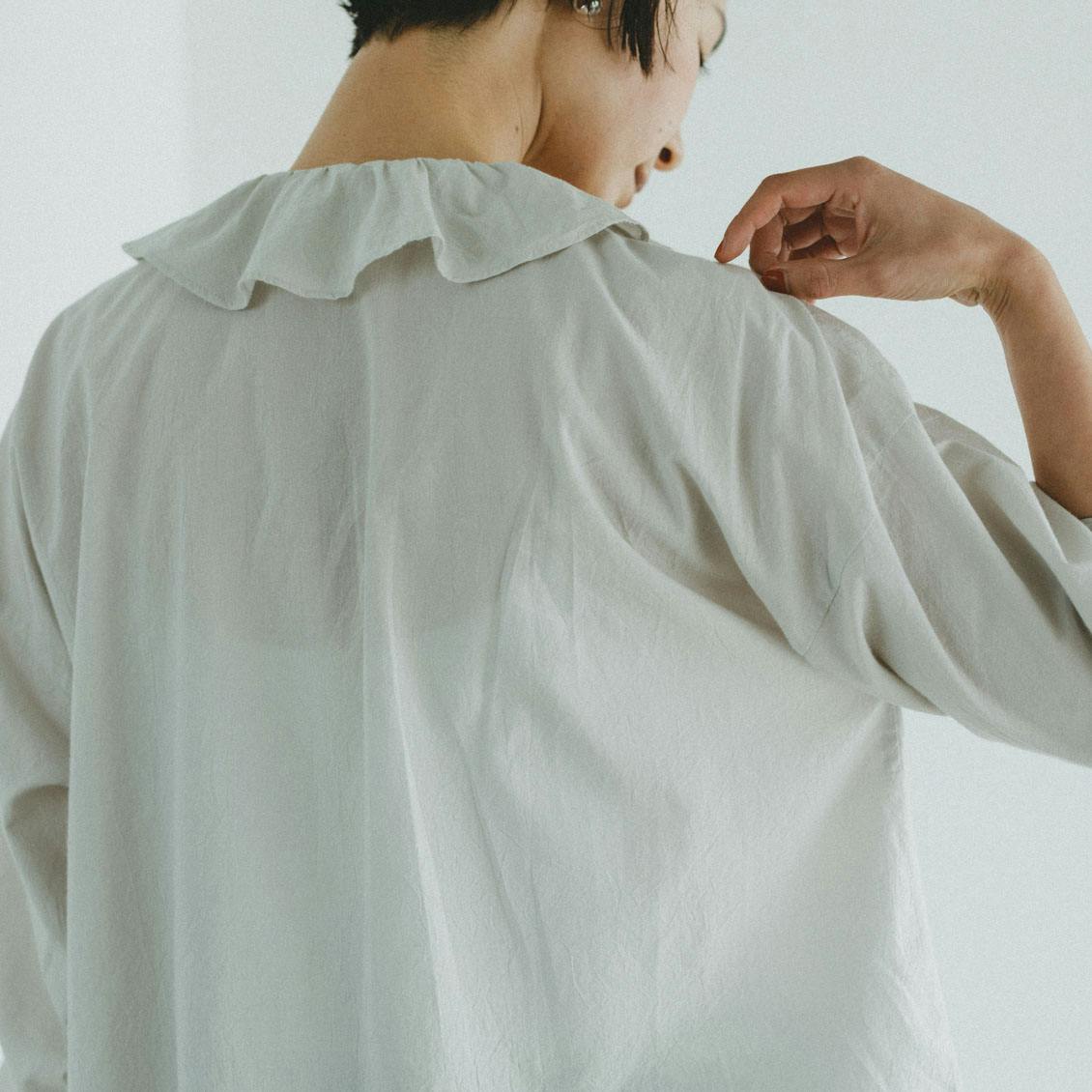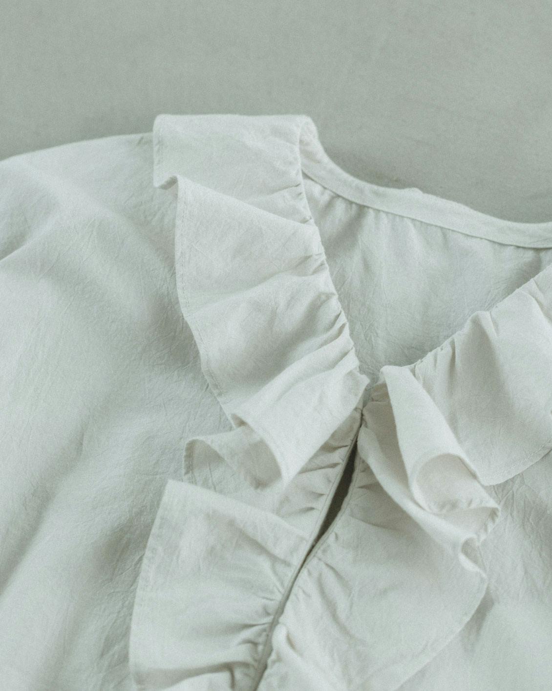 採用したのは、元からシワ加工が施されているコットン100%の素材。そこにさらに洗いをかけ、フリルが立ちすぎず、くったりと柔らかな風合いになるよう仕上げました。