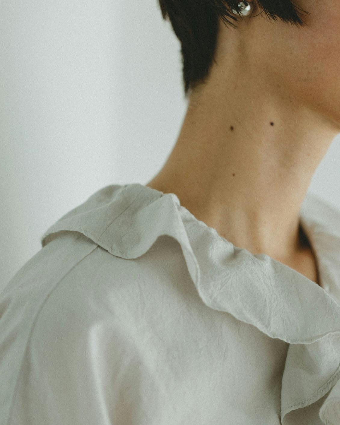 ブラウスの顔となる「フリルカラー」は、ときめくような甘さと、上品なしなやかさをバランスよくチューニング。