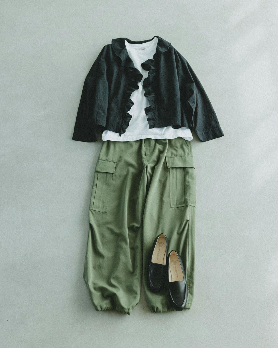 全体のシルエットは甘い襟元とのメリハリを意識し、とことんシンプルに。