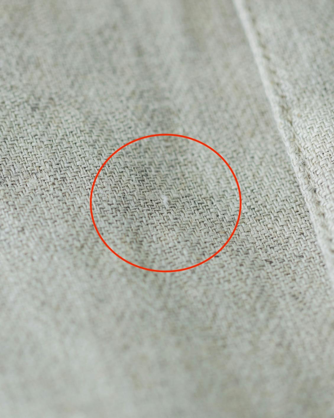 素材の性質上、ネップ(糸が部分的に太くなっている部分)や他の糸の飛び込み、織りムラ、糸の染めムラなどがあります。こちらは製品の風合いとしてお楽しみください。