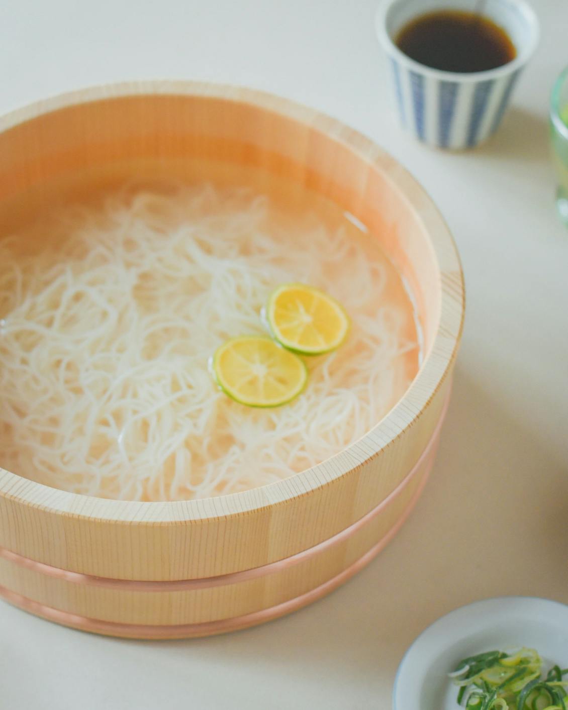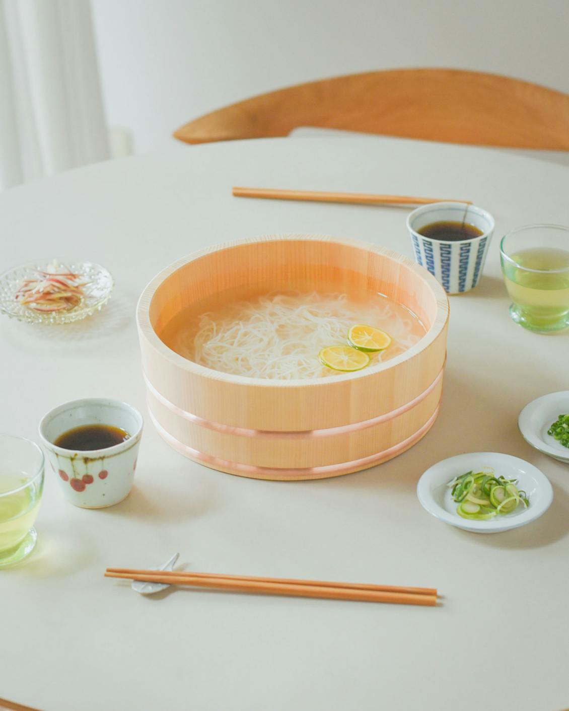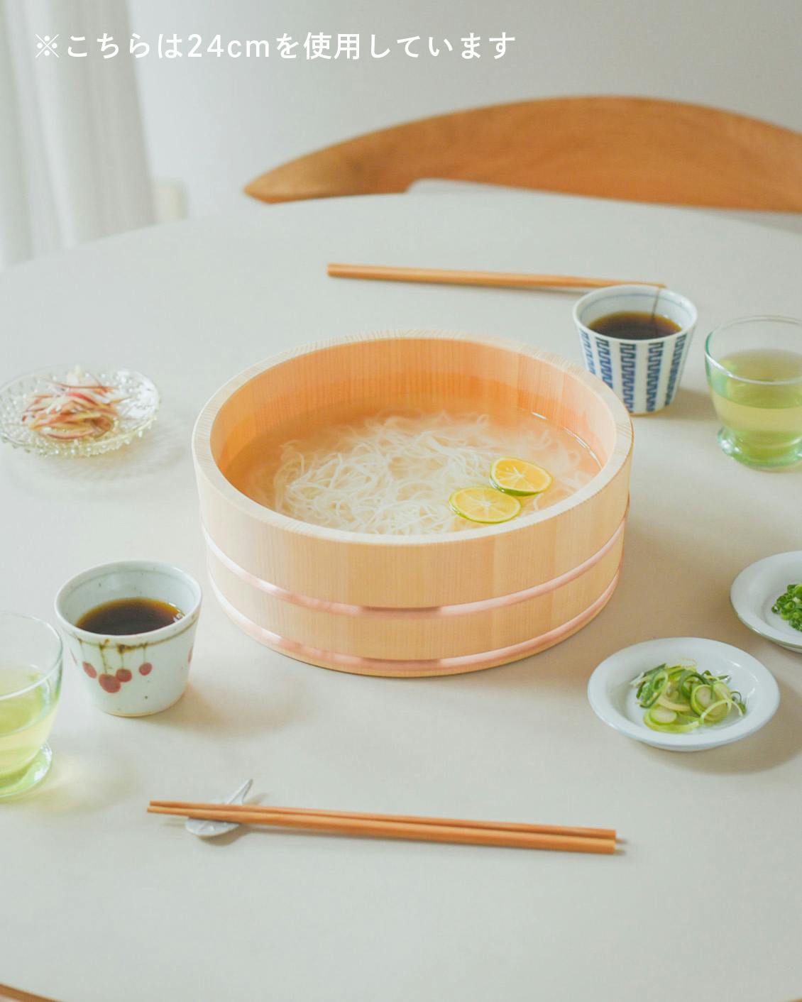 夏になったら、水を張ってそうめんを。木の桶との相性がよく、涼しげで情緒が感じられますよ。